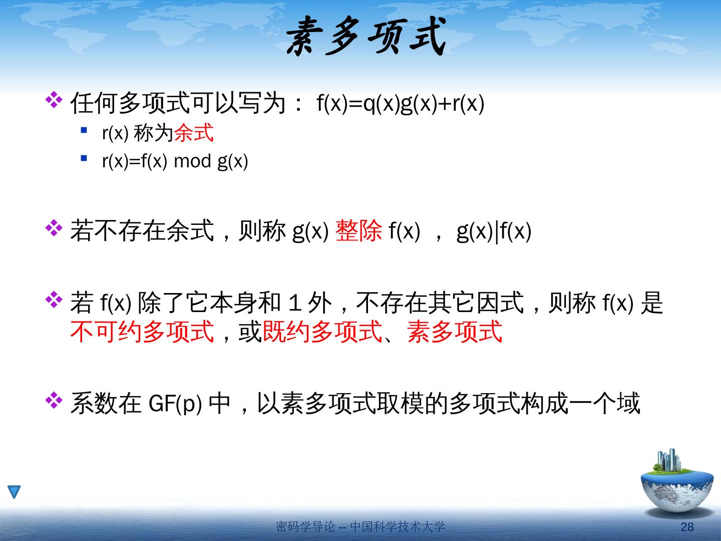 28 .素多项式 任何多项式可以写为: f(x)=q(x)g(x)+r(x) r(x) 称为 余式 r(x)=f(x) mod g(x) 若不存在余式,则称 g(x) 整除 f(x) , g(x)|f(x) 若 f(x) 除了它本身和 1 外,不存在其它因式,则称 f(x) 是 不可约多项式 ,或 既约多项式 、 素多项式 系数在 GF(p) 中,以素多项式取模的多项式构成一个域 密码学导论 -- 中国科学技术大学 28
