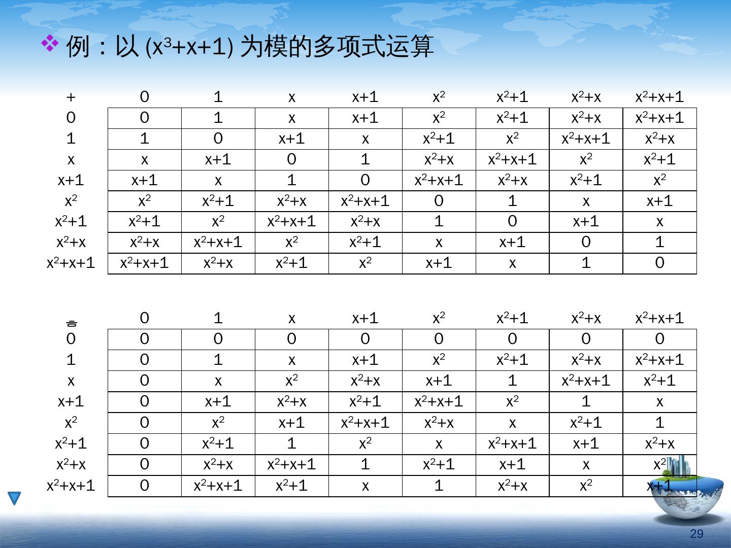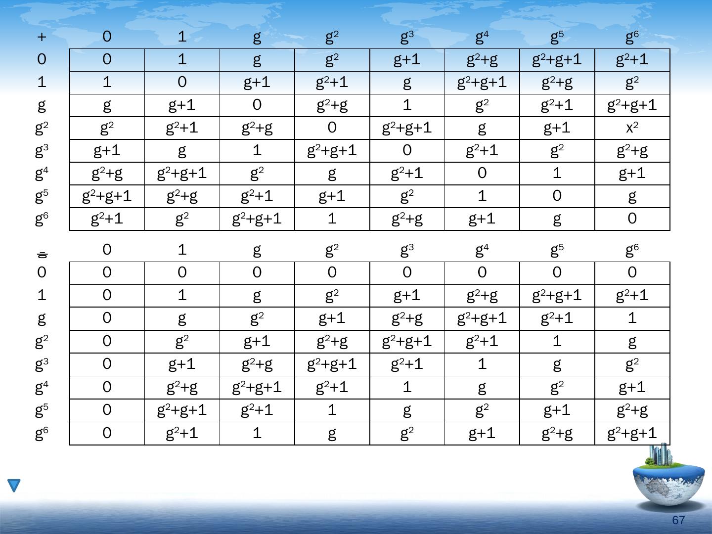 29 .29 例:以 (x 3 +x+1) 为模的多项式运算 + 0 1 x x+1 x 2 x 2 +1 x 2 +x x 2 +x+1 0 0 1 x x+1 x 2 x 2 +1 x 2 +x x 2 +x+1 1 1 0 x+1 x x 2 +1 x 2 x 2 +x+1 x 2 +x x x x+1 0 1 x 2 +x x 2 +x+1 x 2 x 2 +1 x+1 x+1 x 1 0 x 2 +x+1 x 2 +x x 2 +1 x 2 x 2 x 2 x 2 +1 x 2 +x x 2 +x+1 0 1 x x+1 x 2 +1 x 2 +1 x 2 x 2 +x+1 x 2 +x 1 0 x+1 x x 2 +x x 2 +x x 2 +x+1 x 2 x 2 +1 x x+1 0 1 x 2 +x+1 x 2 +x+1 x 2 +x x 2 +1 x 2 x+1 x 1 0 0 1 x x+1 x 2 x 2 +1 x 2 +x x 2 +x+1 0 0 0 0 0 0 0 0 0 1 0 1 x x+1 x 2 x 2 +1 x 2 +x x 2 +x+1 x 0 x x 2 x 2 +x x+1 1 x 2 +x+1 x 2 +1 x+1 0 x+1 x 2 +x x 2 +1 x 2 +x+1 x 2 1 x x 2 0 x 2 x+1 x 2 +x+1 x 2 +x x x 2 +1 1 x 2 +1 0 x 2 +1 1 x 2 x x 2 +x+1 x+1 x 2 +x x 2 +x 0 x 2 +x x 2 +x+1 1 x 2 +1 x+1 x x 2 x 2 +x+1 0 x 2 +x+1 x 2 +1 x 1 x 2 +x x 2 x+1
