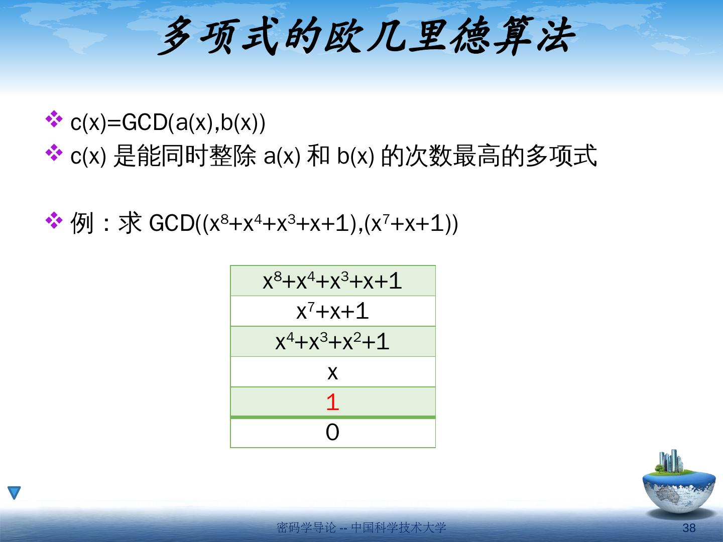23 .普通多项式运算 加法和减法规则:对应项系数的加或减 乘法规则:各项相乘 例:令 f(x) = x 3 + x 2 + 2 和 g(x) = x 2 - x + 1 f(x) + g(x) = x 3 + 2x 2 - x + 3 f(x) - g(x) = x 3 + x + 1 f(x) ×g(x) = x 5 + 3x 2 - 2x + 2 f(x) / g(x) = x + 2 ……x 密码学导论 -- 中国科学技术大学 23