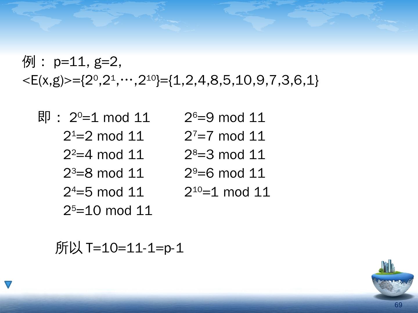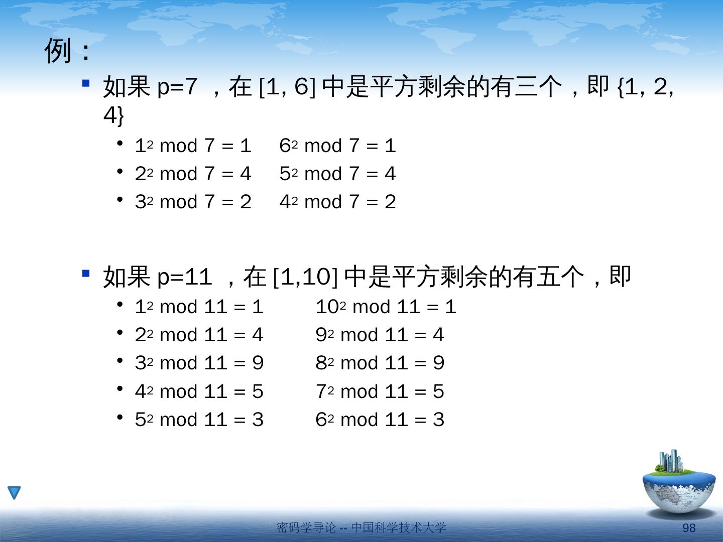 20 .( 1 ) 伽罗瓦域 GF(p) 当模数是素数 p ,每个整数 a∈[1,p-1] 与 p 互素,因而都有唯一的模 p 的乘法逆。这一组模 p 的整数,加上算术运算,被称为有限域 — 伽罗瓦域 GF(p) 的空间是模 p 的完全剩余类 Z p : {0,1, … , p-1} 例, GF(7) 上的运算 密码学导论 -- 中国科学技术大学 20 加法表 乘法表 逆元表 + 0 1 2 3 4 5 6 0 0 1 2 3 4 5 6 1 1 2 3 4 5 6 0 2 2 3 4 5 6 0 1 3 3 4 5 6 0 1 2 4 4 5 6 0 1 2 3 5 5 6 0 1 2 3 4 6 6 0 1 2 3 4 5 0 1 2 3 4 5 6 0 0 0 0 0 0 0 0 1 0 1 2 3 4 5 6 2 0 2 4 6 1 3 5 3 0 3 6 2 5 1 4 4 0 4 1 5 2 6 3 5 0 5 3 1 6 4 2 6 0 6 5 4 3 2 1 w 0 1 2 3 4 5 6 -w 0 6 5 4 3 2 1 w -1 - 1 4 5 2 3 6