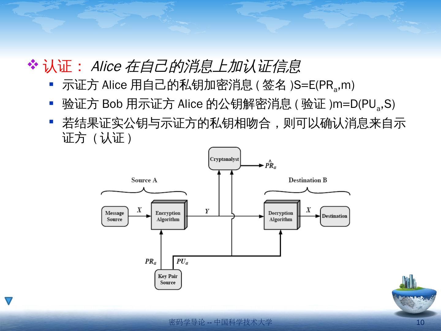 9 .公钥密码体制的主要应用 保密: Alice 要发消息给 Bob Alice 用 Bob 的公钥对消息加密 C=E( PU b ,m ) Bob 收到消息后,用其私钥对消息解密 M=D( PR b ,C ) 只有 Bob 知道自身的私钥,其他接收者均不能解密消息 密码学导论 -- 中国科学技术大学 9
