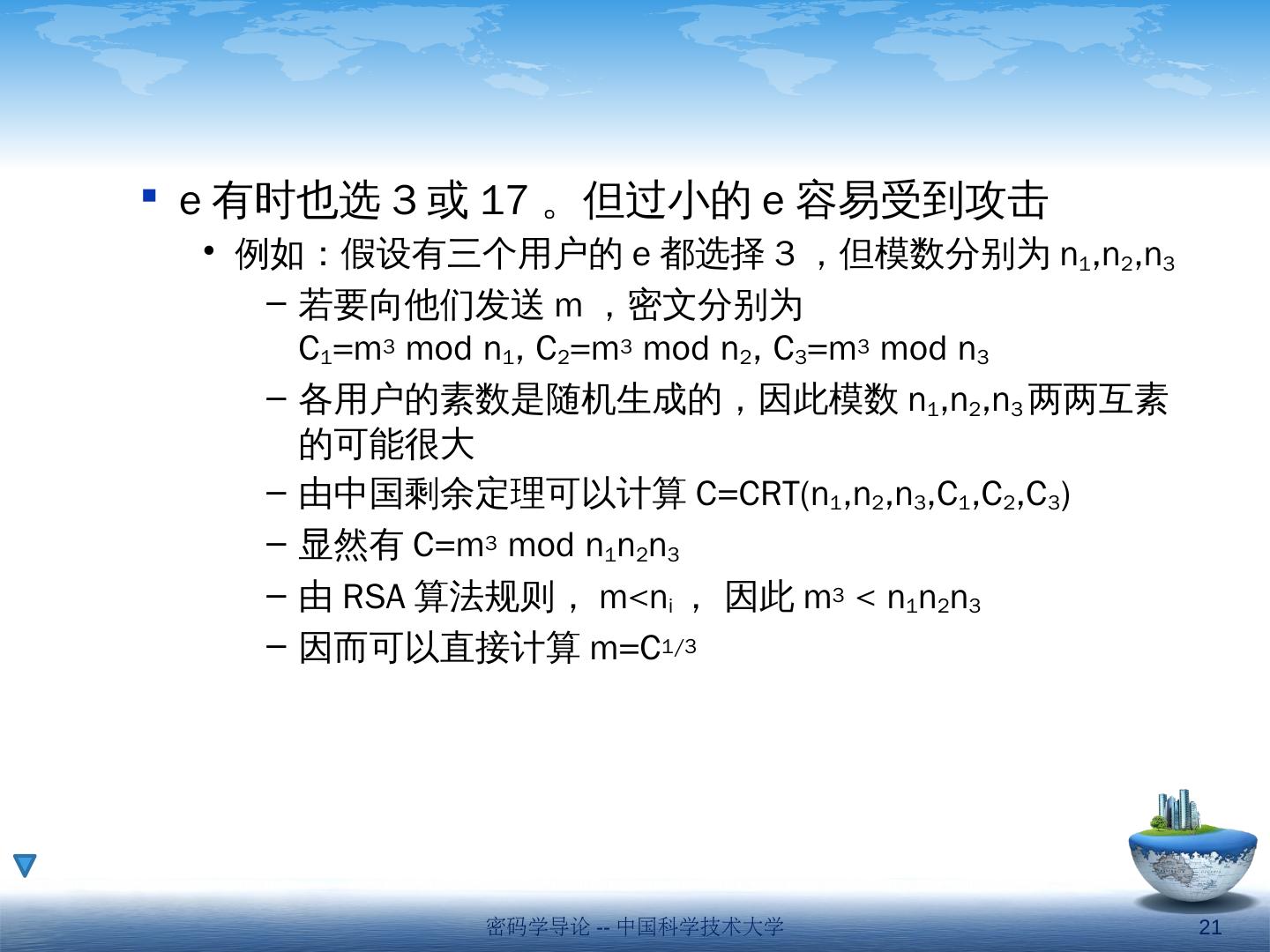 20 .实现方面的考虑 加密与解密 模指数运算,可通过下面两个手段减少运算量 模运算特性 [(a mod n) op (b mod n)] mod n = (a op b) mod n 快速指数算法 公钥的有效 运算 e 常选 65537( 即 2 16 +1) :仅有两个比特为 1 ,乘法 次数最小 若先选择 e ,再选择 p,q ,则为 保证 gcd (e, Φ (n))= 1 , 选择 p,q 时 应保证 gcd (e,p-1 )= gcd (e,q-1)= 1 密码学导论 -- 中国科学技术大学 20