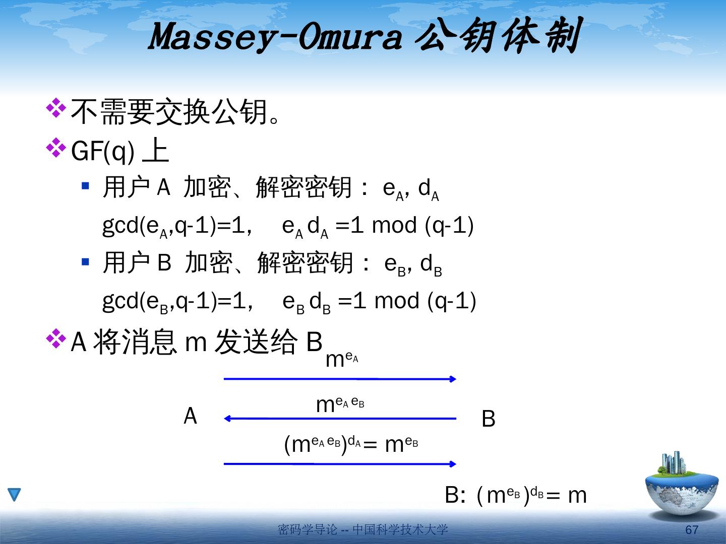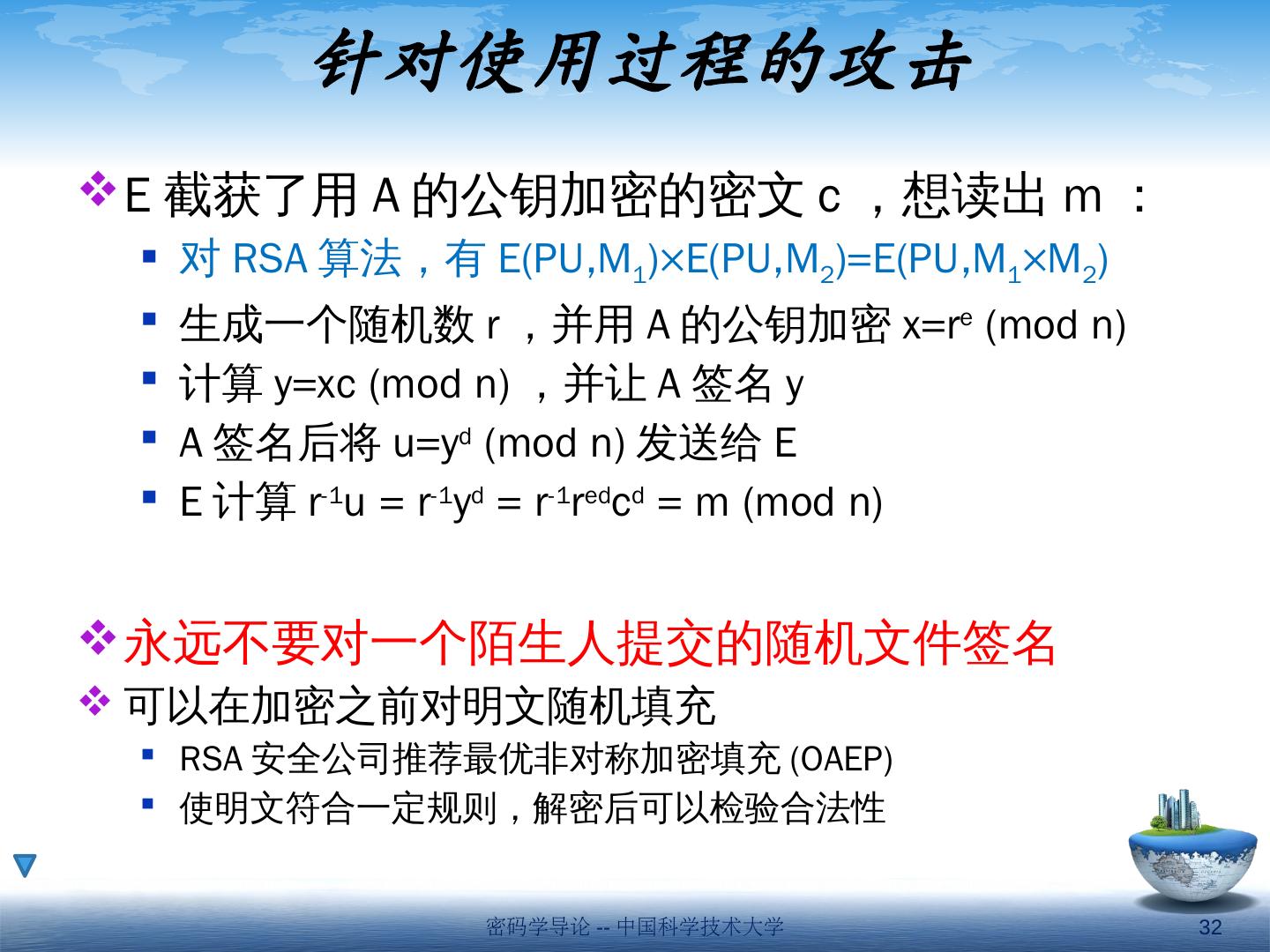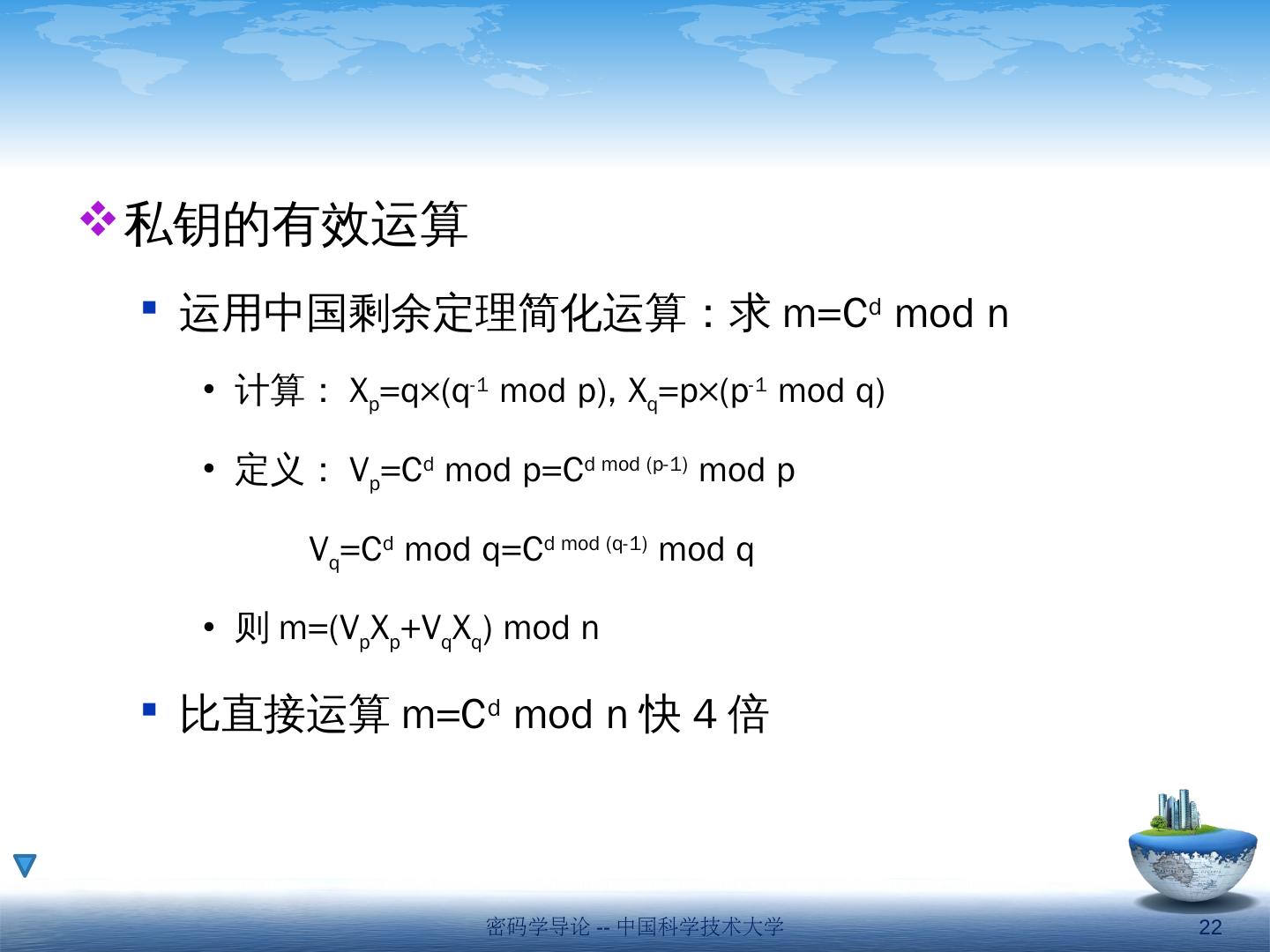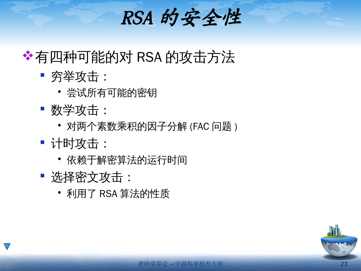 22 .私钥的有效运算 运用中国剩余定理简化运算:求 m=C d mod n 计算: X p =q×(q -1 mod p), X q =p×(p -1 mod q) 定义: V p = C d mod p= C d mod (p-1) mod p V q =C d mod q=C d mod (q-1) mod q 则 m=( V p X p +V q X q ) mod n 比直接运算 m=C d mod n 快 4 倍 密码学导论 -- 中国科学技术大学 22