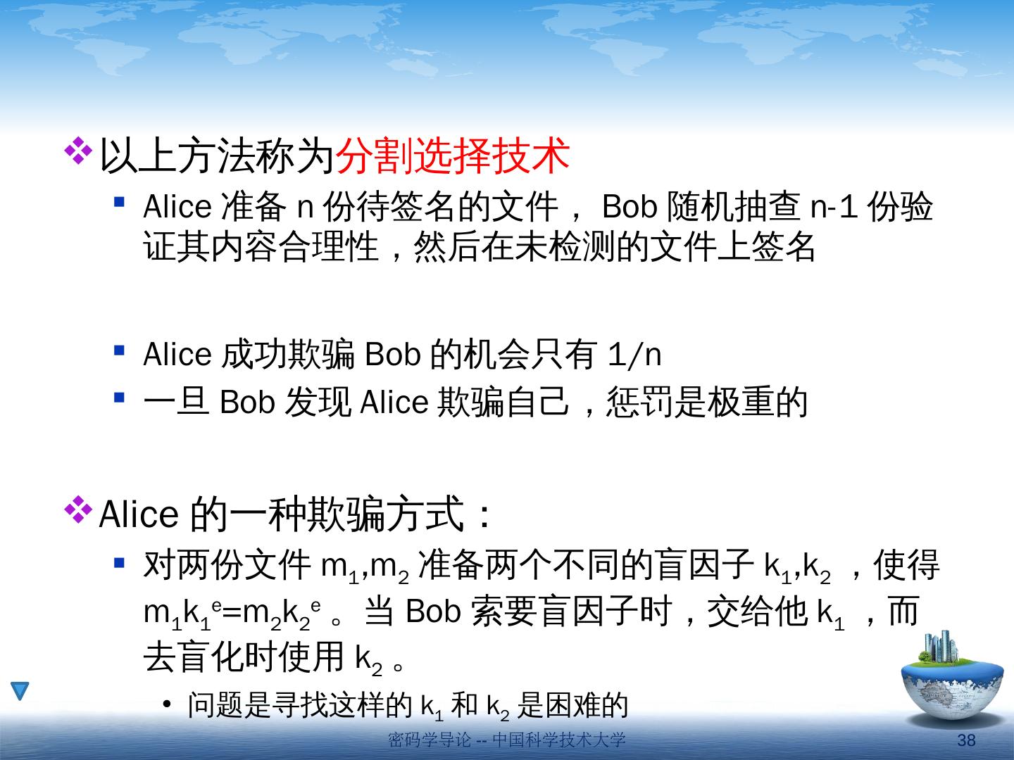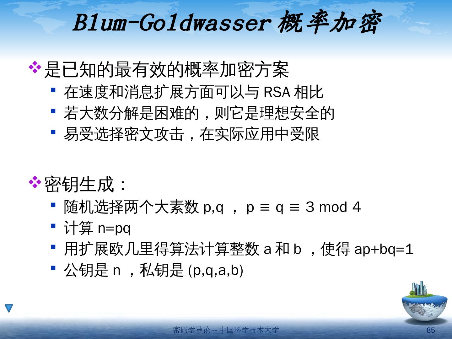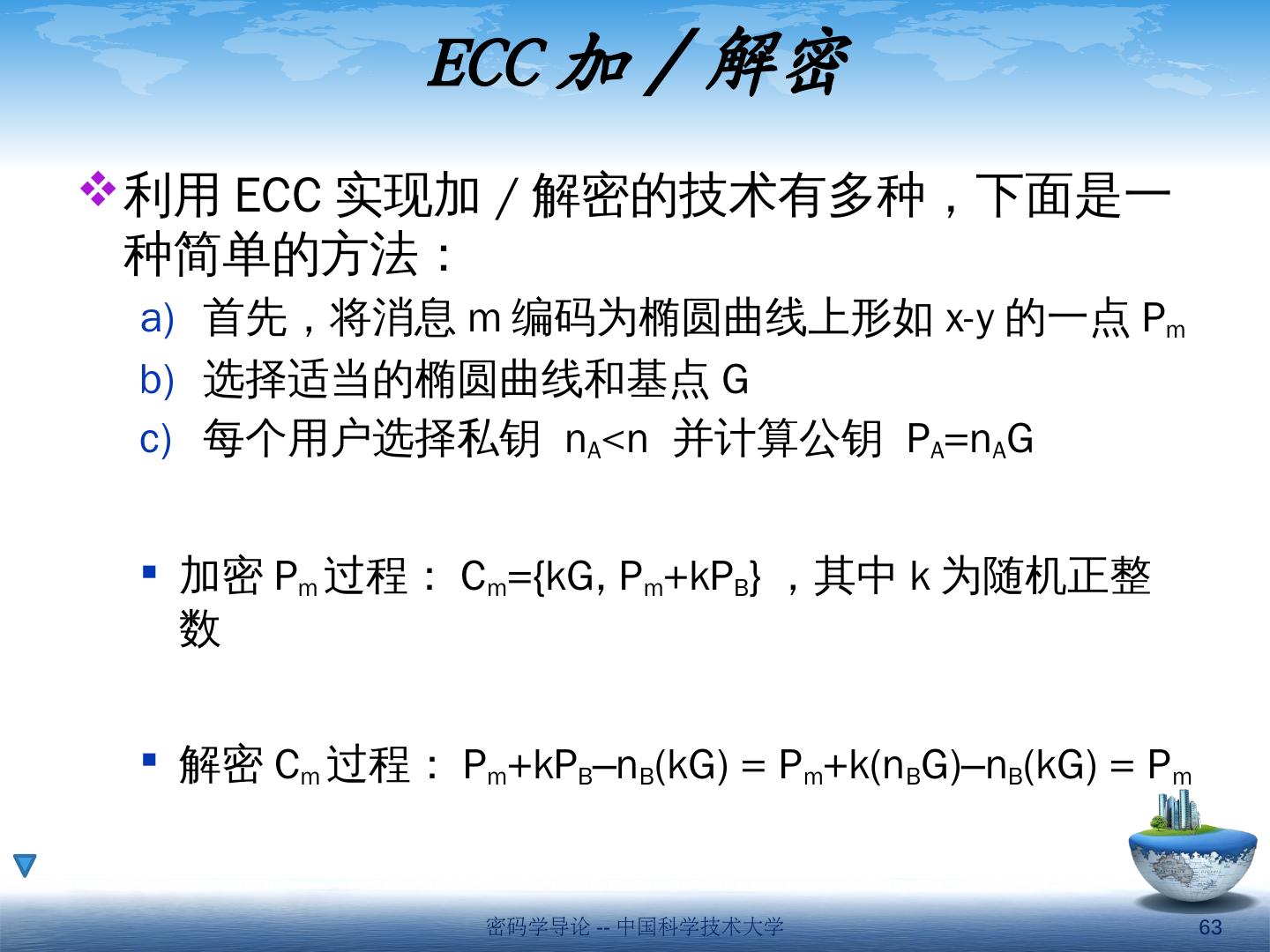 22 .私钥的有效运算 运用中国剩余定理简化运算:求 m=C d mod n 计算: X p =q×(q -1 mod p), X q =p×(p -1 mod q) 定义: V p = C d mod p= C d mod (p-1) mod p V q =C d mod q=C d mod (q-1) mod q 则 m=( V p X p +V q X q ) mod n 比直接运算 m=C d mod n 快 4 倍 密码学导论 -- 中国科学技术大学 22