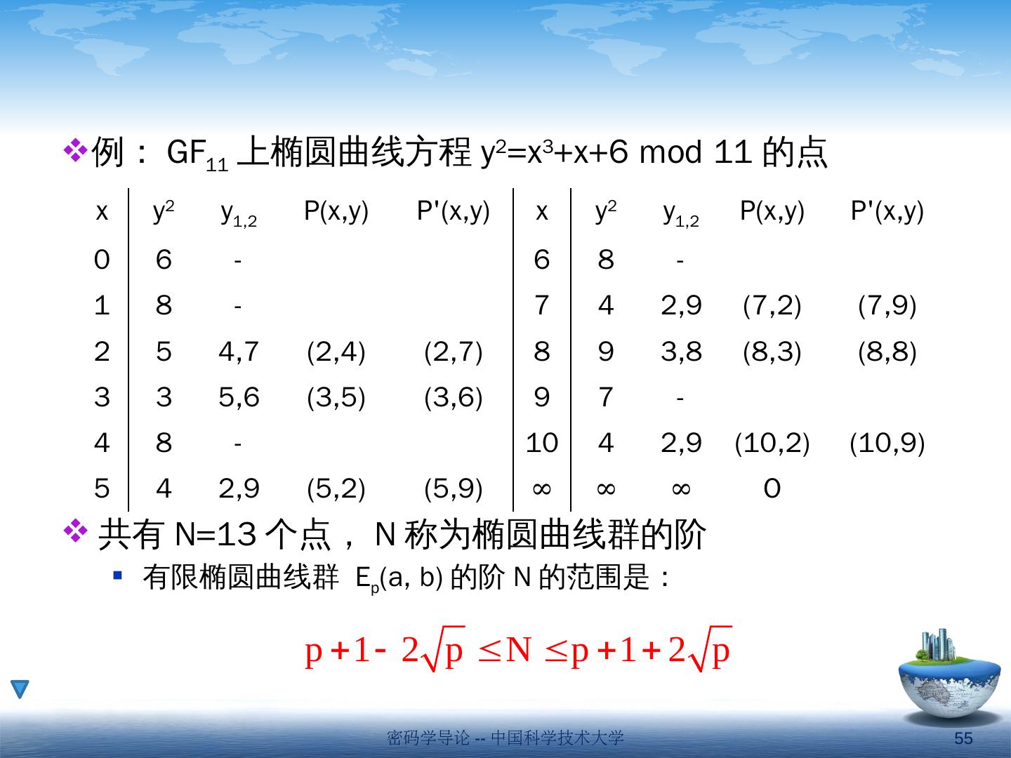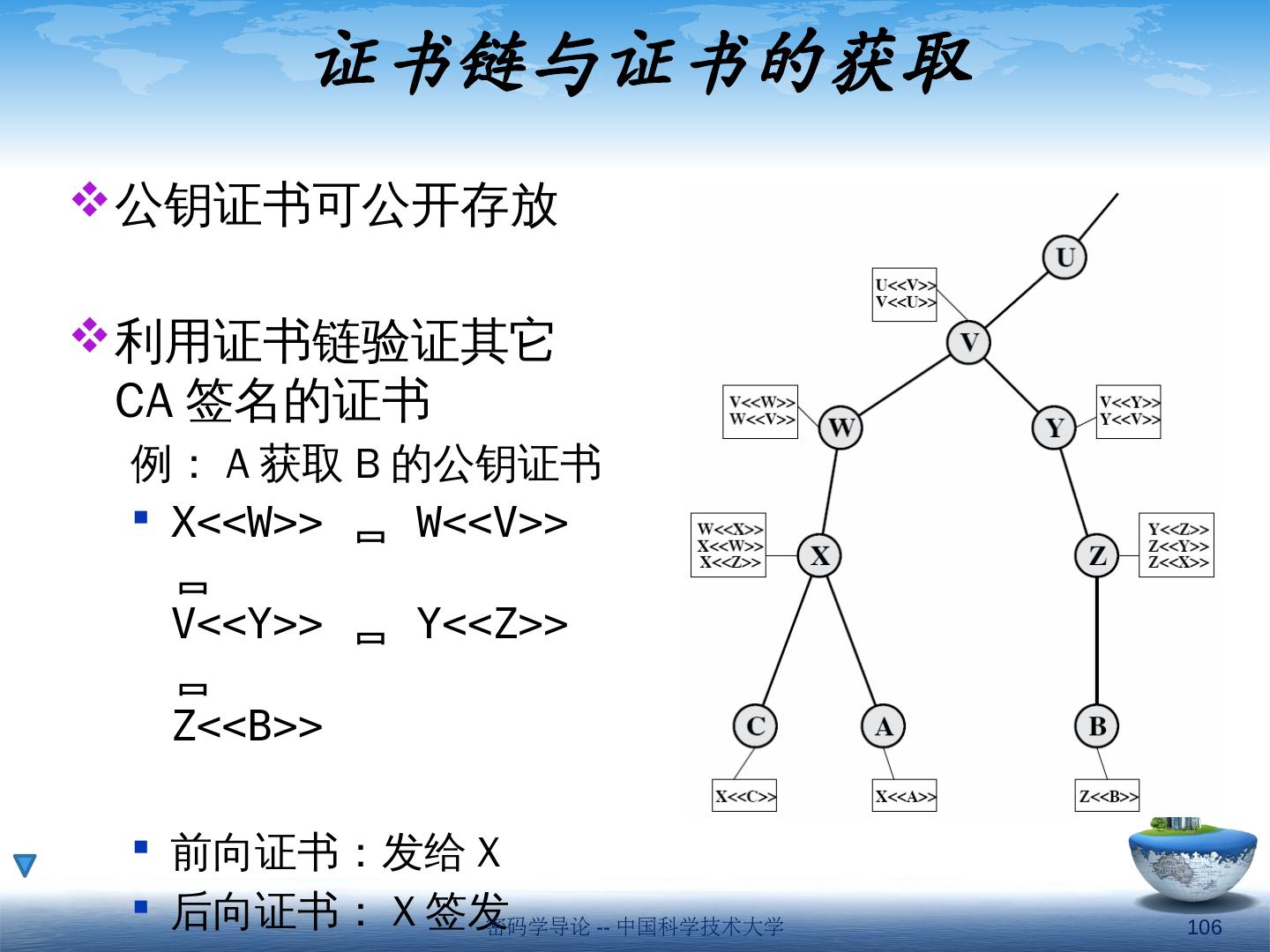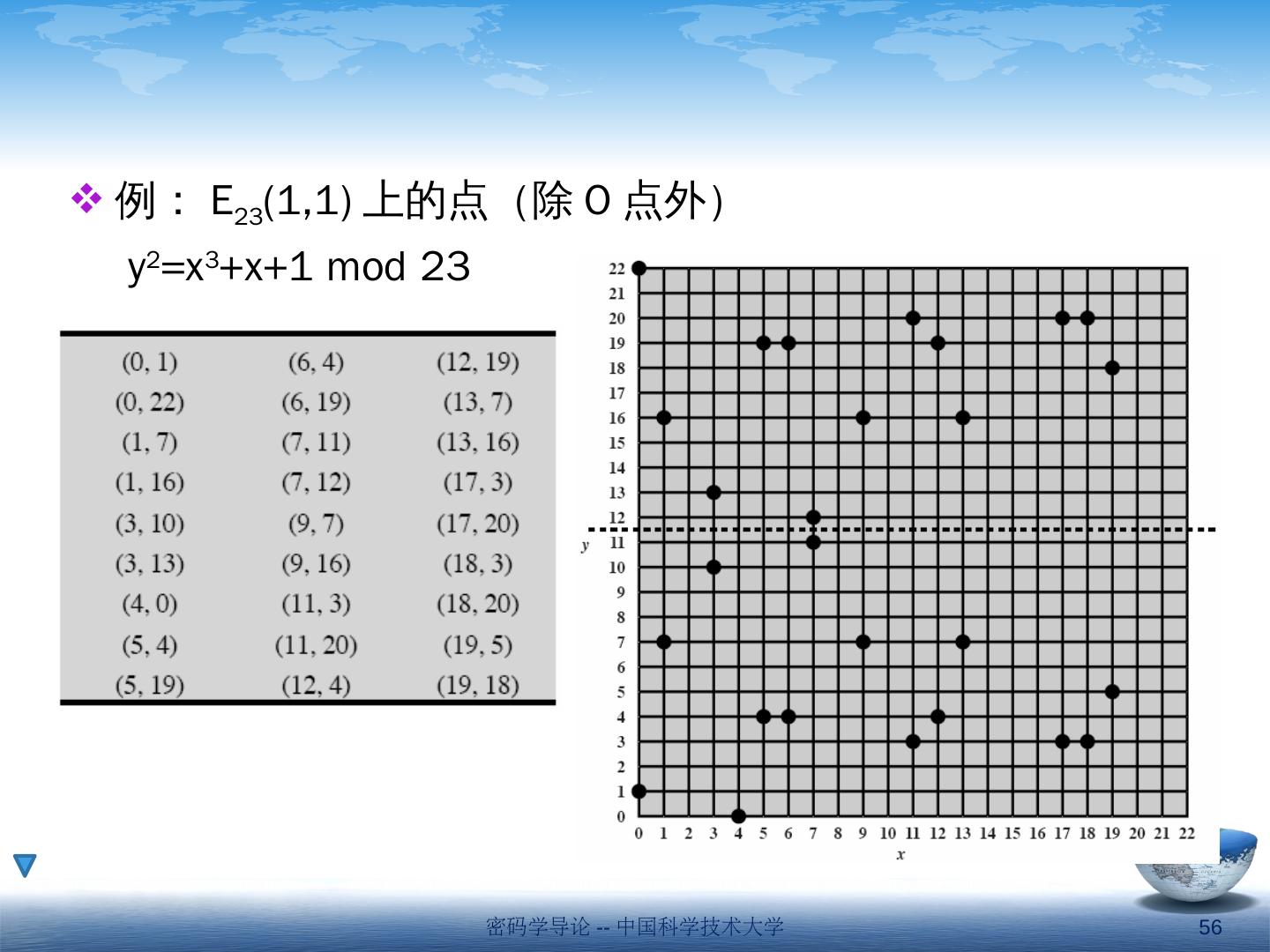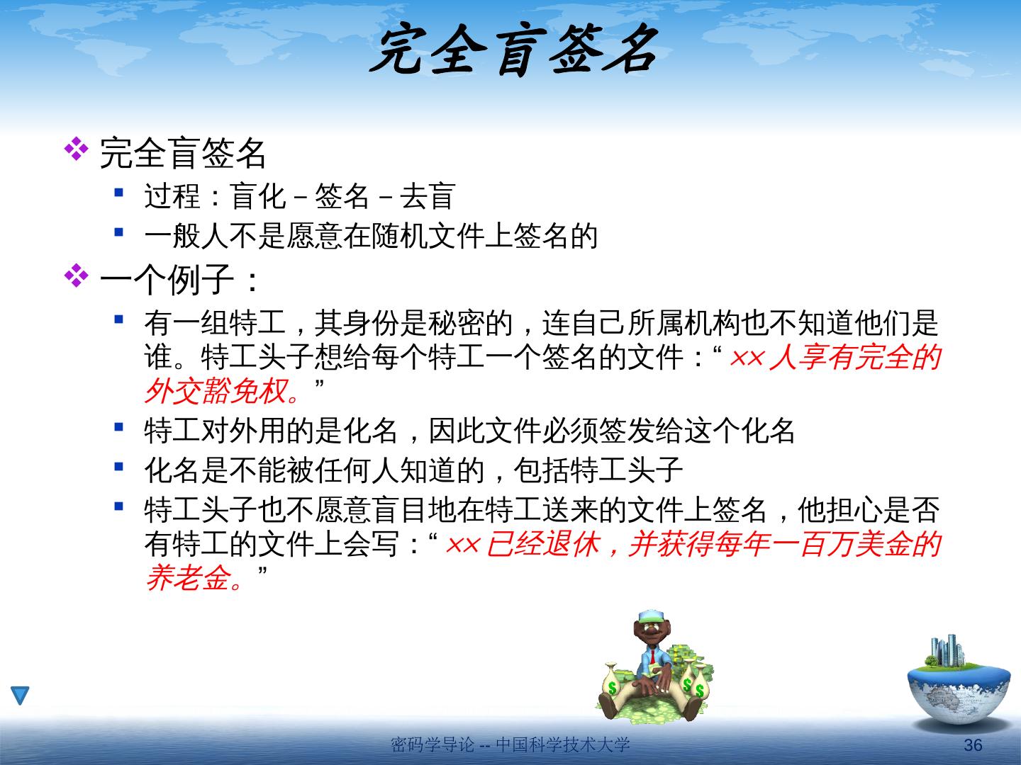 22 .私钥的有效运算 运用中国剩余定理简化运算:求 m=C d mod n 计算: X p =q×(q -1 mod p), X q =p×(p -1 mod q) 定义: V p = C d mod p= C d mod (p-1) mod p V q =C d mod q=C d mod (q-1) mod q 则 m=( V p X p +V q X q ) mod n 比直接运算 m=C d mod n 快 4 倍 密码学导论 -- 中国科学技术大学 22