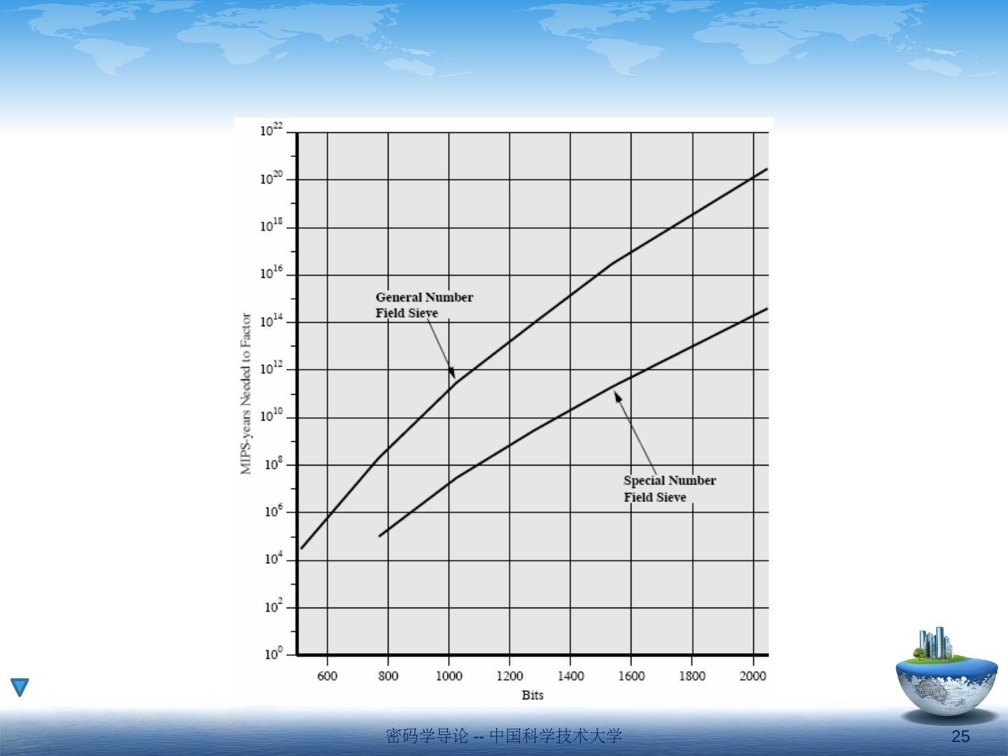 24 .数学攻击 数学攻击: 分解 n 为两个素数 p,q ,并进而求出 d 直接找出 Φ (n) ,并进而求出 d 直接找出 d RSA 的安全性问题依赖于大合数的素因子分解,即 factorization problem (FAC) 2005 年分解了 200 位十进制(约 664 bits )大合数 2009 年分解了 232 位十进制( 768 bits )大合数 当前,密钥应选取 1024 或 2048 位 密码学导论 -- 中国科学技术大学 24