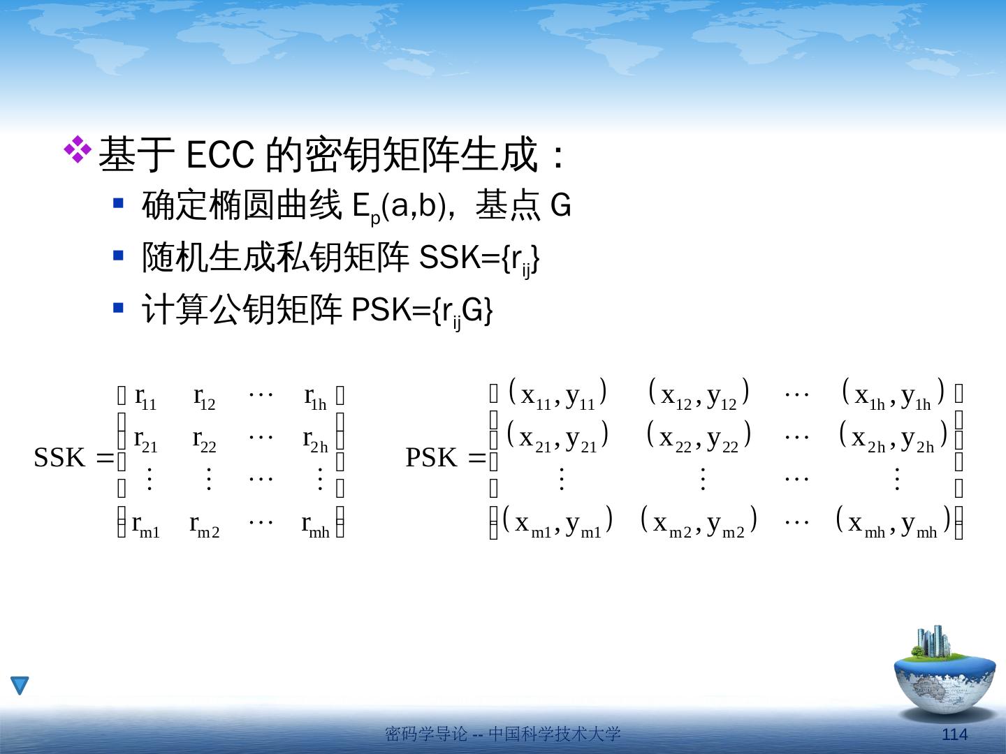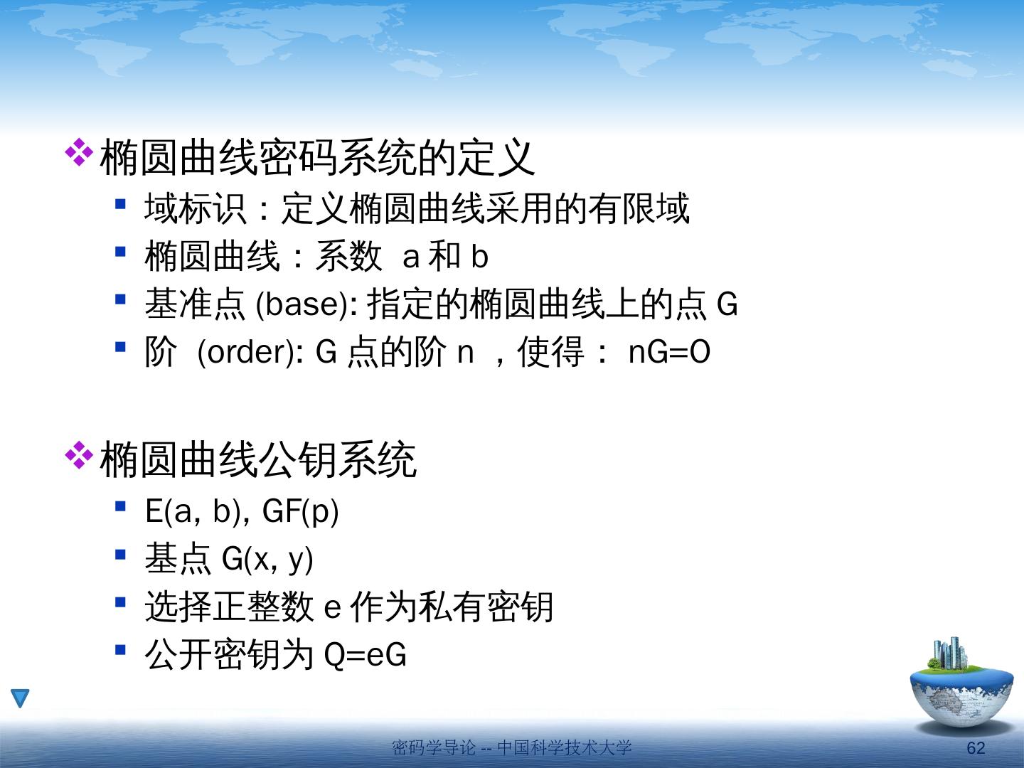 8 .公开密钥密码体制 公钥密码体制的组成 明文:算法的输入,可读信息或数据 加密算法:对明文进行各种转换 公钥和私钥:算法的输入,分别用于加密和解密 每一用户产生一对密钥,用来加密和解密消息 其中 一个密钥(公钥)存于公开的寄存器或其他可访问的文件中;另一密钥(私钥)秘密 保存 密文:算法的输出,依赖于明文和密钥 解密算法:根据密文和密钥,还原明文 密码学导论 -- 中国科学技术大学 8