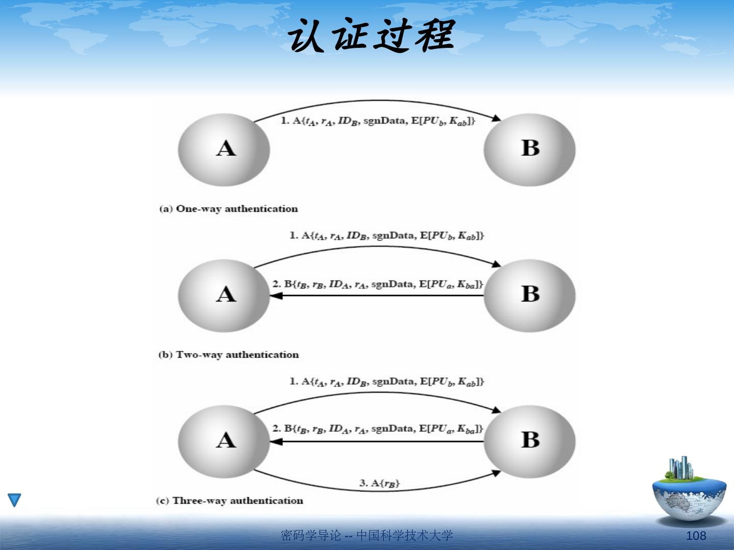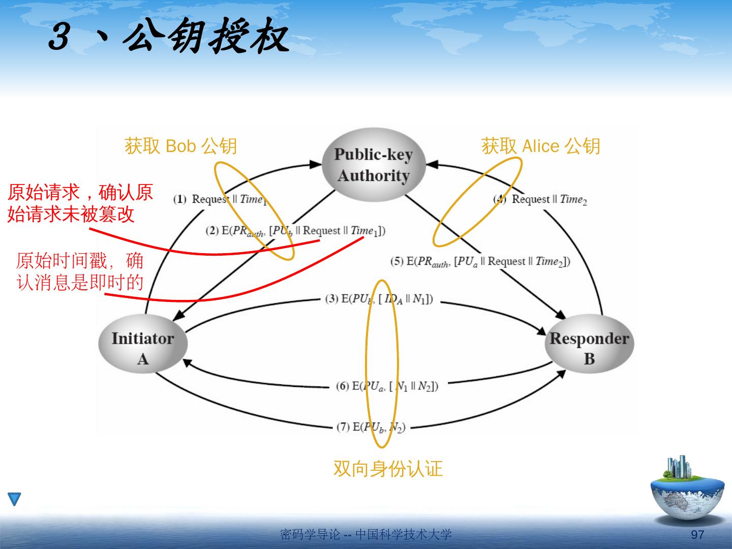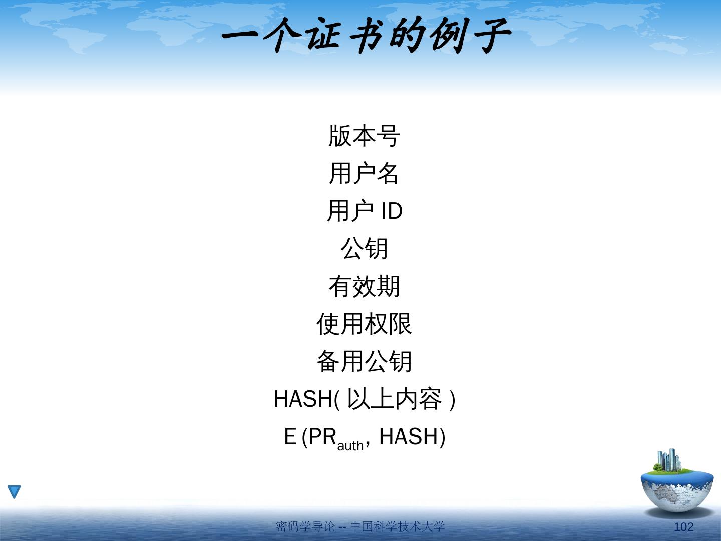 10 .认证 : Alice 在 自己的消息上加认证信息 示证 方 Alice 用 自己的私钥加密消息 ( 签名 )S=E( PR a ,m ) 验证 方 Bob 用 示证 方 Alice 的 公钥解密消息 ( 验证 )m=D( PU a ,S ) 若结果证实公钥与示证方的私钥相吻合,则可以确认消息来自示证方 ( 认证 ) 密码学导论 -- 中国科学技术大学 10