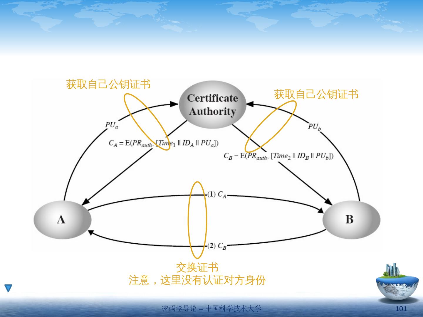 11 .即保密又认证: 把保密 和 认证过程结合起来 密钥交换 : 例如 Diffie -Hellman C = E( PU b , D( PR a , m)) m = E( PU a , D( PR b , C)) 密码学导论 -- 中国科学技术大学 11