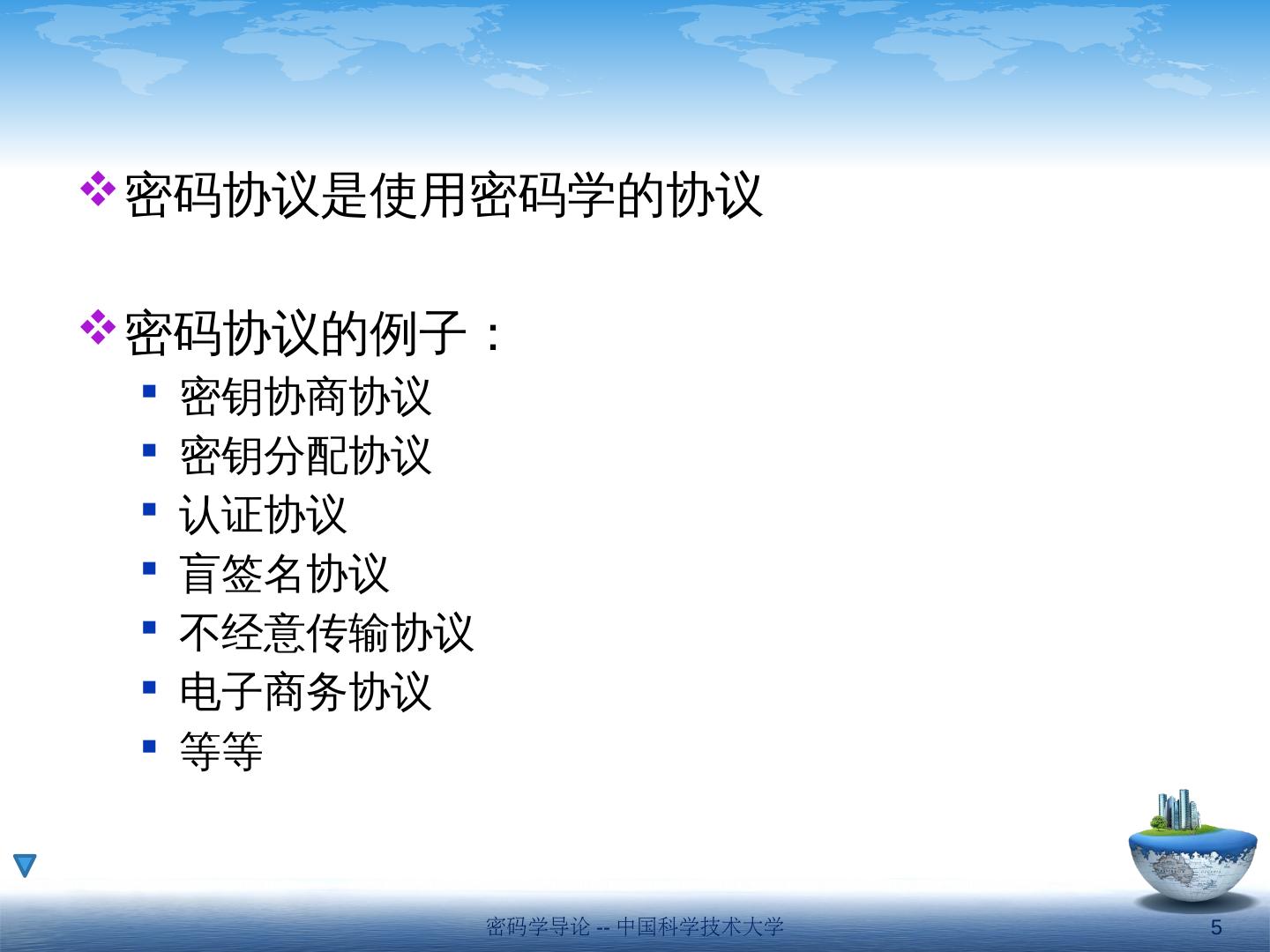 4 .一、密码协议的概念 协议 protocol :是指两个或两个以上的参与者为完成某项特定的任务而采取的一系列步骤。 一系列步骤:必须依次完成的序列 包括两方或多方 目的是完成一项任务 协议被执行的条件 协议中的每个人都必须了解协议,预先知道所要完成的步骤 协议中的每个人都必须同意并遵循它 协议必须是清楚的,每一步定义明确,不会引起误解 协议必须是完整的,没有可能的情况都必须规定具体的动作 密码学导论 -- 中国科学技术大学 4