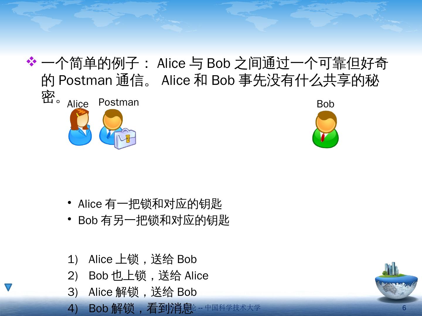 6 .一个简单的例子: Alice 与 Bob 之间通过一个可靠但好奇的 Postman 通信。 Alice 和 Bob 事先没有什么共享的秘密。 Alice 有一把锁和对应的钥匙 Bob 有另一把锁和对应的钥匙 Alice 上锁,送给 Bob Bob 也上锁,送给 Alice Alice 解锁,送给 Bob Bob 解锁,看到消息 密码学导论 -- 中国科学技术大学 6 Alice Bob Postman