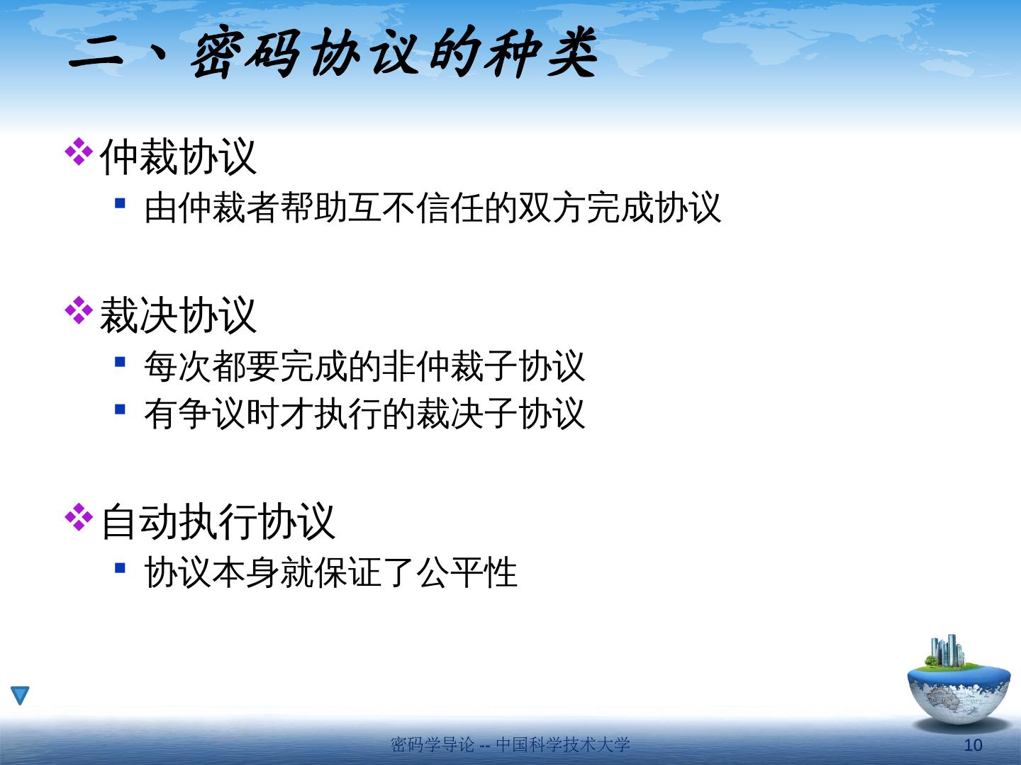 10 .二、密码协议的种类 仲裁协议 由仲裁者帮助互不信任的双方完成协议 裁决协议 每次都要完成的非仲裁子协议 有争议时才执行的裁决子协议 自动执行协议 协议本身就保证了公平性 密码学导论 -- 中国科学技术大学 10