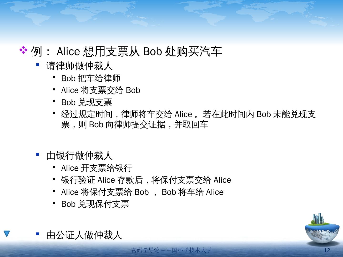 11 .仲裁协议 Trent :可信第三方,仲裁者 仲裁者在协议中没有既得利益,与通信人没有利害关系 所有人都接受: 仲裁者说的都是真实的 仲裁者做的都是正确的 仲裁者会忠实地完成协议中涉及他的部分 密码学导论 -- 中国科学技术大学 11 Alice Bob Trent