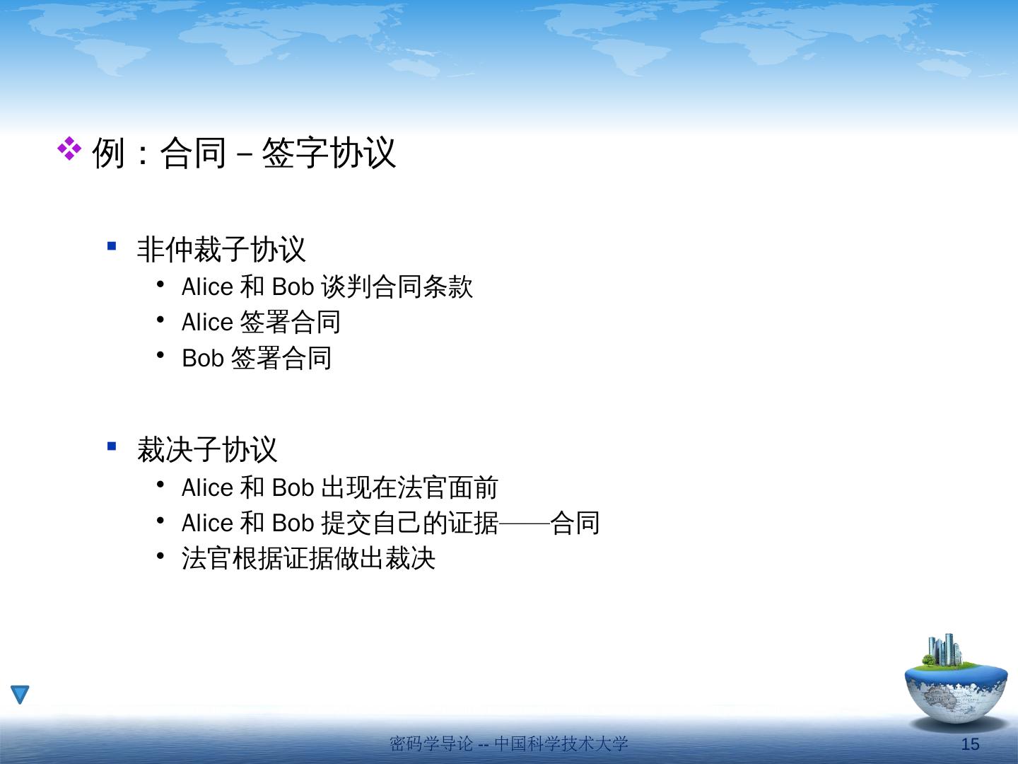 15 .例:合同-签字协议 非仲裁子协议 Alice 和 Bob 谈判合同条款 Alice 签署合同 Bob 签署合同 裁决子协议 Alice 和 Bob 出现在法官面前 Alice 和 Bob 提交自己的证据 —— 合同 法官根据证据做出裁决 密码学导论 -- 中国科学技术大学 15