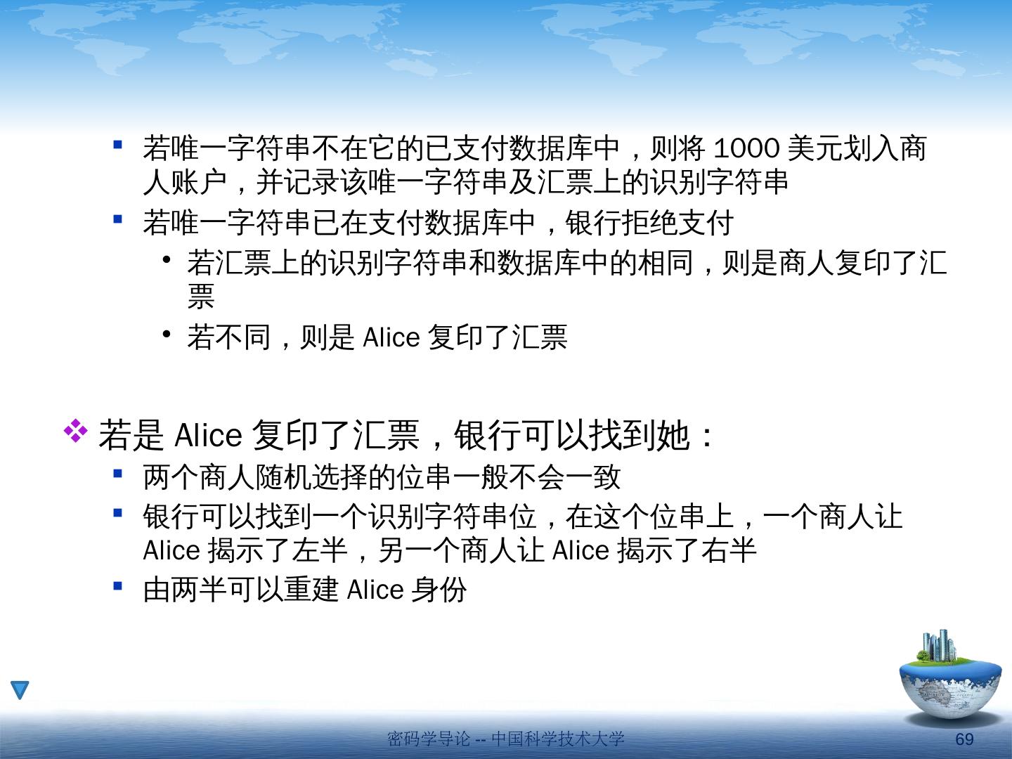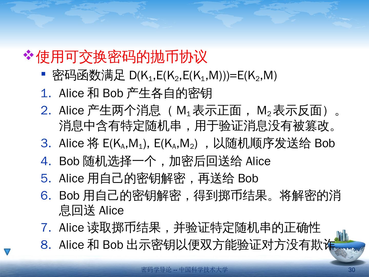 29 .二、公平的硬币抛掷 懒人 Alice 和 Bob 住在一起,一天没水喝了。于是两人想通过掷硬币的方式决定谁去打水。可是没有实际的物理东东让他们抛掷。两人决定用思维来抛掷硬币,然后将两人的结果异或 两人都不相信对方会遵守协议,都努力窃取对方结果 一个解决办法是写下来再出示(不会被掉包?) 可以用位承诺协议来辅助完成: Alice 做一个随机位的承诺 Bob 来猜测这个位 Alice 揭示结果,若 Bob 猜中,则 Bob 赢,否则 Bob 输 密码学导论 -- 中国科学技术大学 28