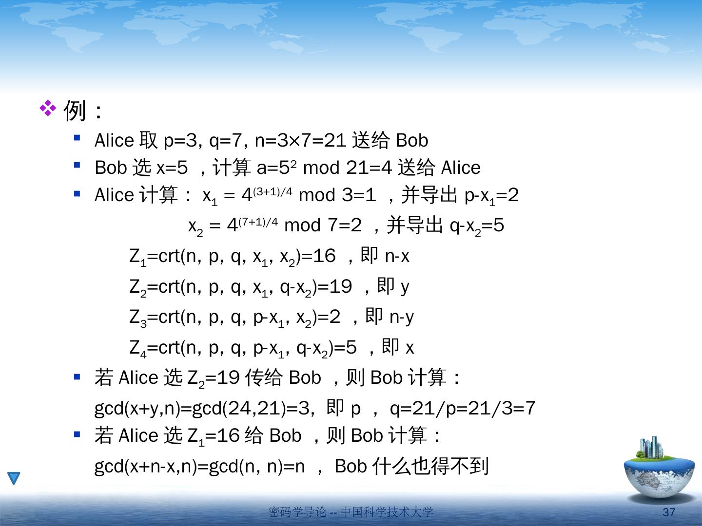 8 .当采用按位异或加密时 Alice -> Bob: M⊕K A Bob -> Alice: (M⊕K A )⊕K B Alice -> Bob: (M⊕K A ⊕K B )⊕K A =M⊕K B Bob: (M⊕K B )⊕K B =M Postman: ( M⊕K A ) ⊕ [(M⊕K A )⊕K B ] ⊕ (M⊕K B )=M 密码学导论 -- 中国科学技术大学 8