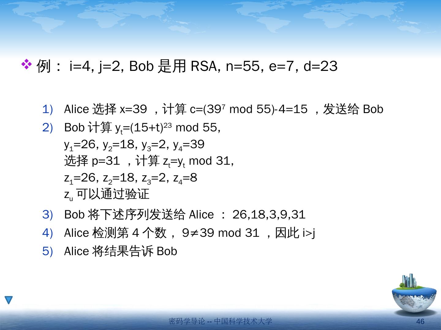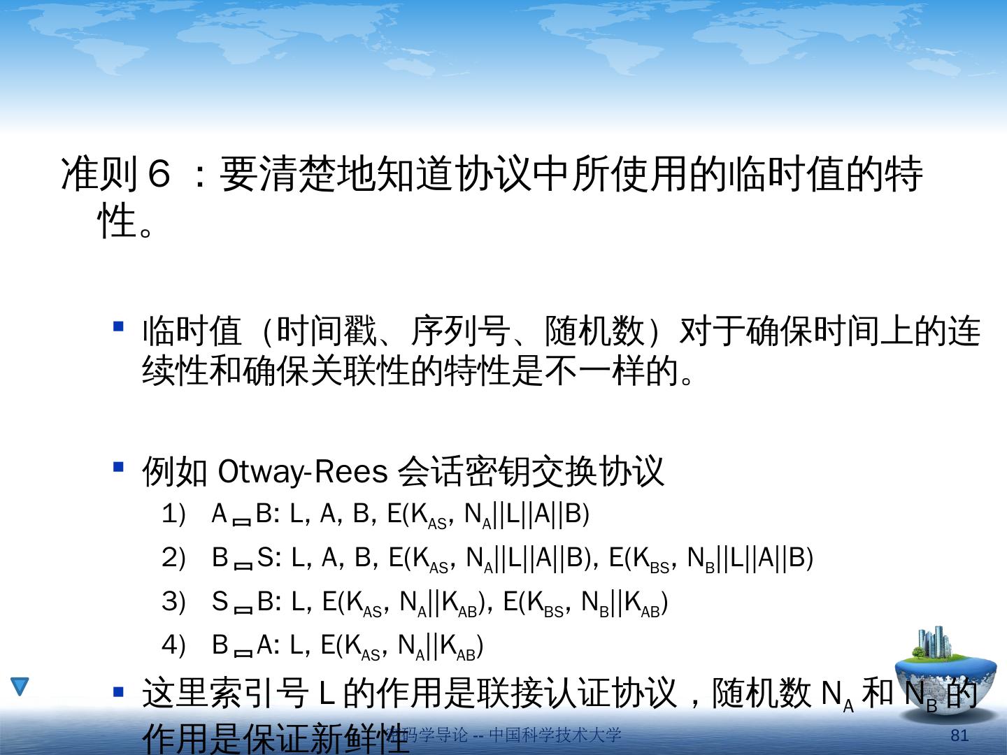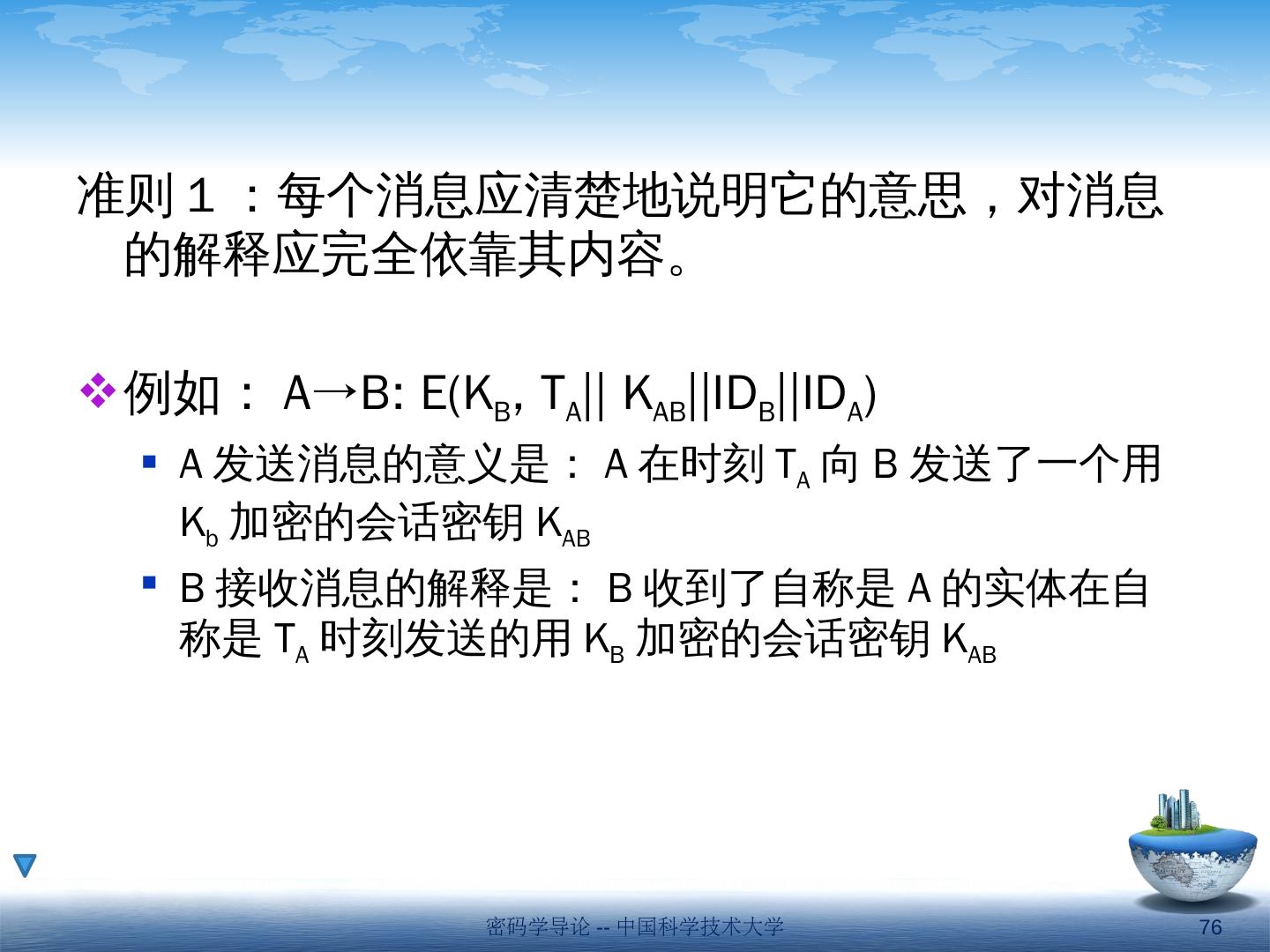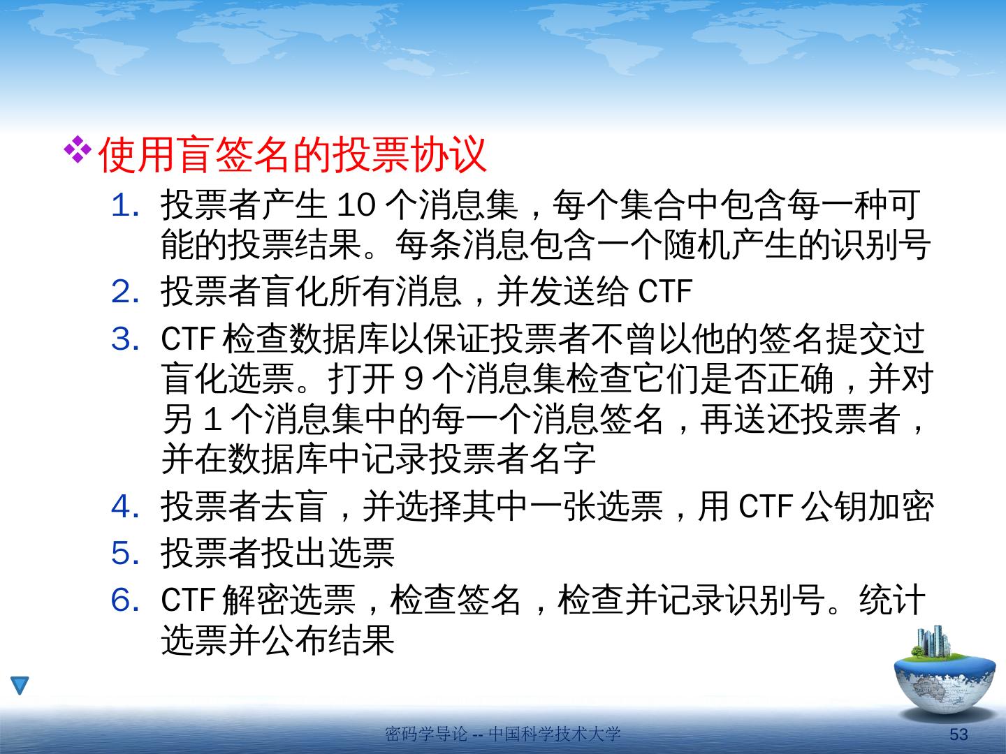 5 .密码协议是使用密码学的协议 密码协议的例子: 密钥协商协议 密钥分配协议 认证协议 盲签名协议 不经意传输协议 电子商务协议 等等 密码学导论 -- 中国科学技术大学 5