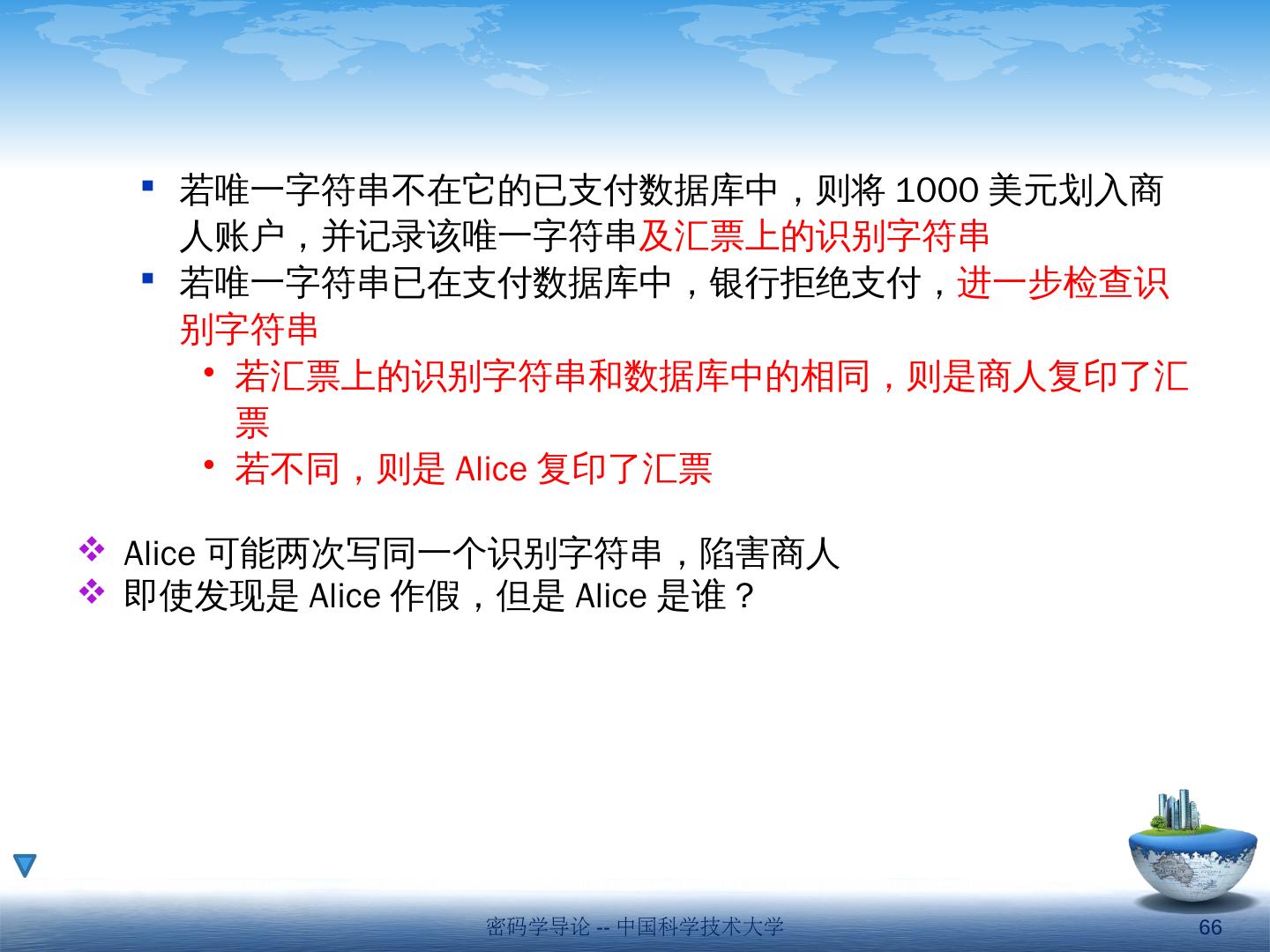 12 .例: Alice 想用支票从 Bob 处购买汽车 请律师做仲裁人 Bob 把车给律师 Alice 将支票交给 Bob Bob 兑现支票 经过规定时间,律师将车交给 Alice 。若在此时间内 Bob 未能兑现支票,则 Bob 向律师提交证据,并取回车 由银行做仲裁人 Alice 开支票给银行 银行验证 Alice 存款后,将保付支票交给 Alice Alice 将保付支票给 Bob , Bob 将车给 Alice Bob 兑现保付支票 由公证人做仲裁人 密码学导论 -- 中国科学技术大学 12