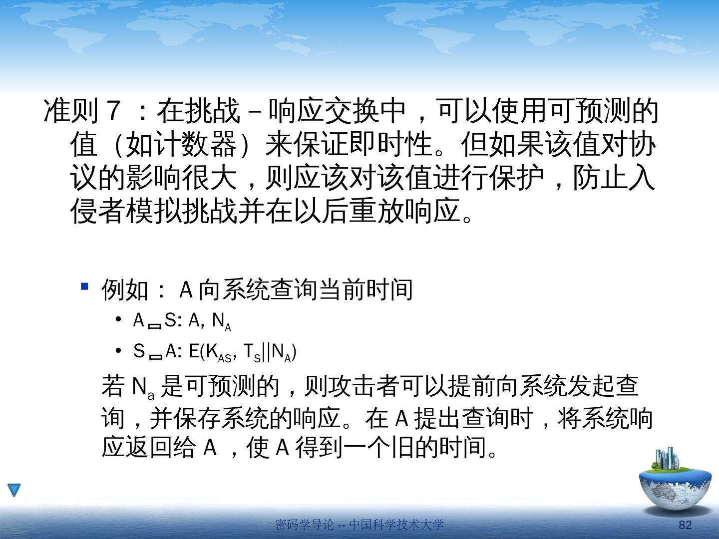 21 .设计密码协议的注意事项 尽量用一次性随机数代替时间戳 回避时钟同步 具备抵抗常见攻击的能力 明确使用于网络结构的哪个协议层 明确所需的数据处理能力 明确所采用的密码算法 便于进行功能扩充 最少的安全假设 密码学导论 -- 中国科学技术大学 21