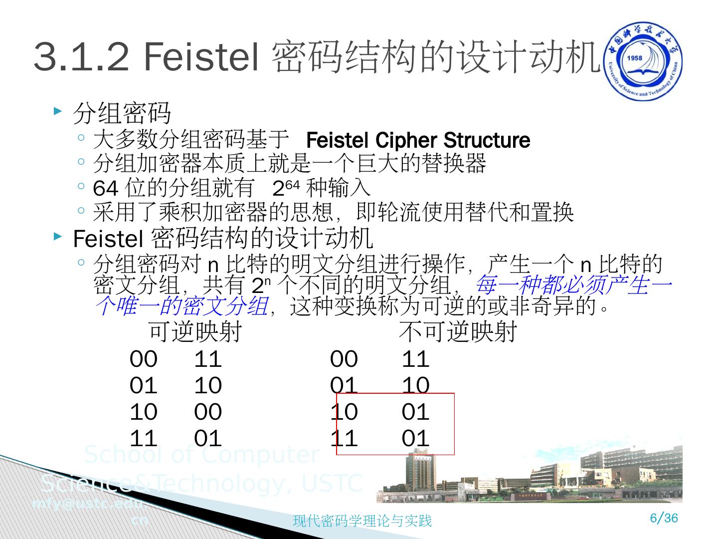 6 .3.1.2 Feistel 密码结构的设计动机 分组密码 大多数分组密码基于 Feistel Cipher Structure 分组加密器本质上就是一个巨大的替换器 64 位的分组就有 2 64 种输入 采用了乘积加密器的思想,即轮流使用替代和置换 Feistel 密码结构的设计动机 分组密码对 n 比特的明文分组进行操作,产生一个 n 比特的密文分组,共有 2 n 个不同的明文分组, 每一种都必须产生一个唯一的密文分组 ,这种变换称为可逆的或非奇异的。 可逆映射 不可逆映射 00 11 00 11 01 10 01 10 10 00 10 01 11 01 11 01