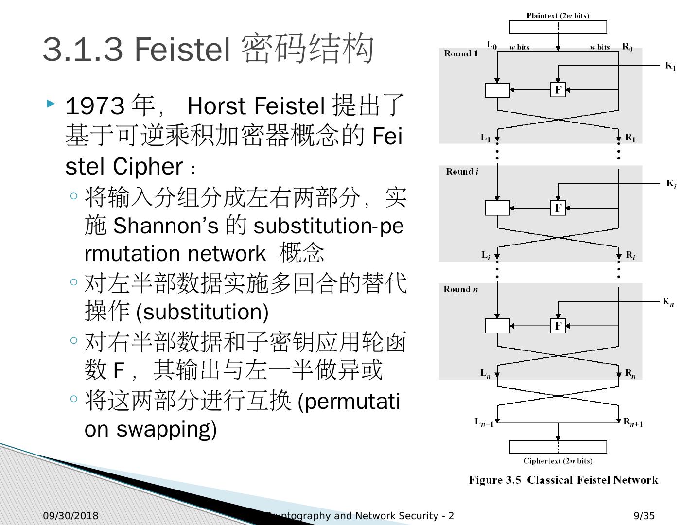 9 .2018/9/13 Cryptography and Network Security - 2 9 /35 3.1.3 Feistel 密码结构 1973 年, Horst Feistel 提出了基于可逆乘积加密器概念的 Feistel Cipher : 将输入分组分成左右两部分,实施 Shannon’s 的 substitution-permutation network 概念 对左半部数据实施多回合的替代操作 (substitution) 对右半部数据和子密钥应用轮函数 F ,其输出与左一半做异或 将这两部分进行互换 ( permutation swapping )
