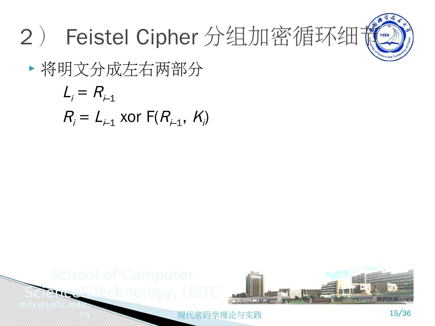 15 .将明文分成左右两部分 L i = R i –1 R i = L i –1 xor F( R i –1 , K i ) 2 ) Feistel Cipher 分组加密 循环细节