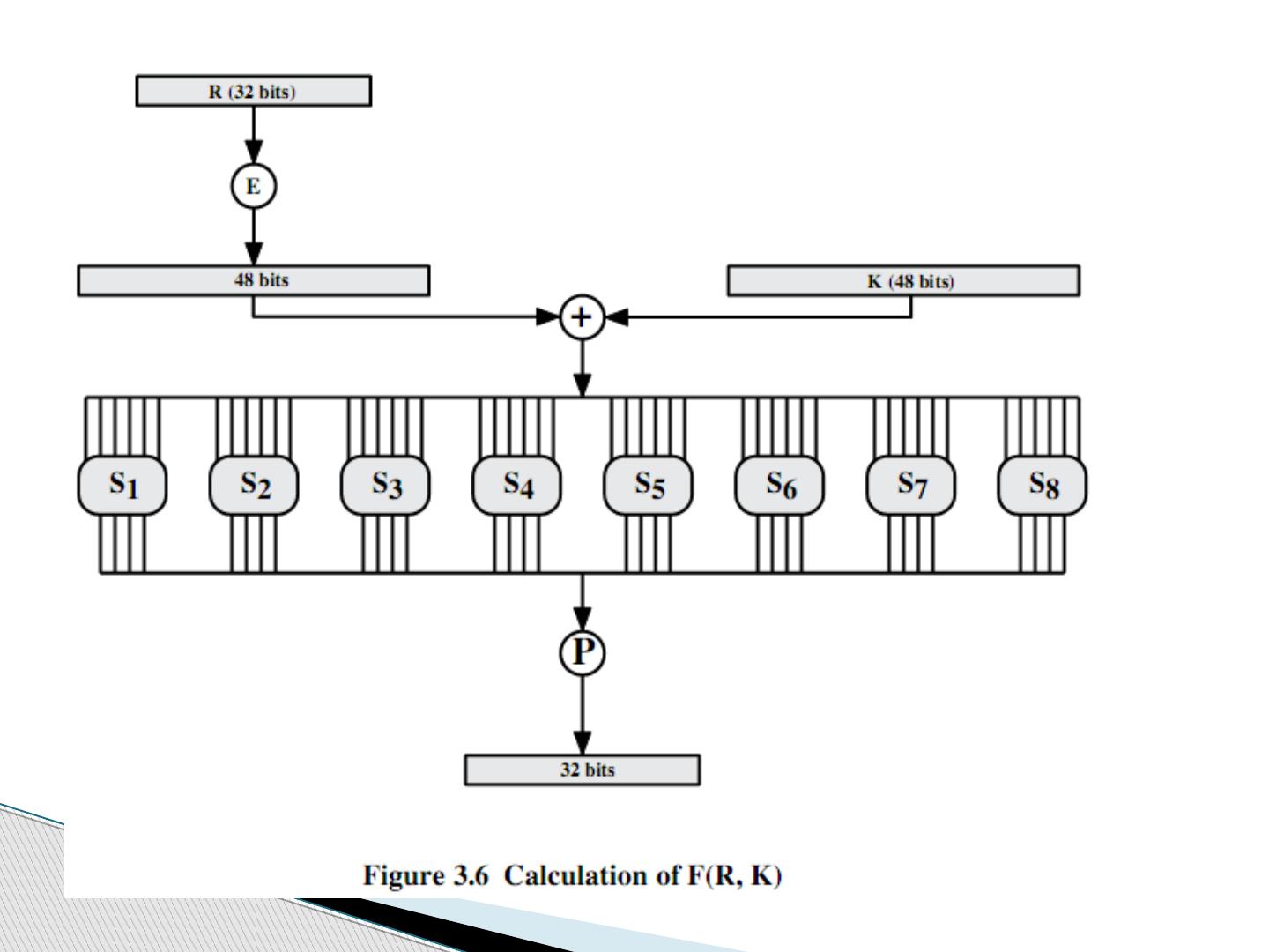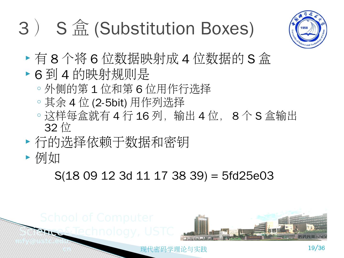 19 .3 ) S 盒 (Substitution Boxes) 有 8 个将 6 位数据映射成 4 位数据的 S 盒 6 到 4 的映射规则是 外侧的第 1 位和第 6 位用作行选择 其余 4 位 (2-5bit) 用作列选择 这样每盒就有 4 行 16 列,输出 4 位, 8 个 S 盒输出 32 位 行的选择依赖于数据和密钥 例如 S(18 09 12 3d 11 17 38 39) = 5fd25e03