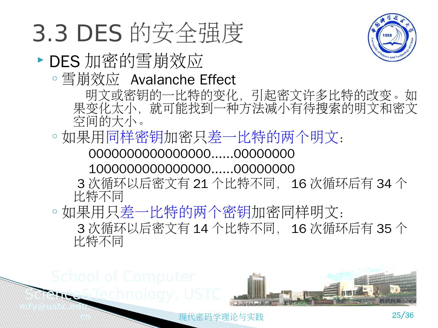 25 .DES 加密的雪崩效应 雪崩 效应 Avalanche Effect 明文或密钥的一比特的变化,引起密文许多比特的改变。如果变化太小,就可能找到一种方法减小有待搜索的明文和密文空间的大小。 如果用 同样密钥 加密只 差一比特的两个明文 : 0000000000000000......00000000 1000000000000000......00000000 3 次循环以后密文有 21 个比特不同, 16 次循环后有 34 个比特不同 如果用只 差一比特的两个密钥 加密同样明文: 3 次循环以后密文有 14 个比特不同, 16 次循环后有 35 个比特不同 3.3 DES 的安全强度