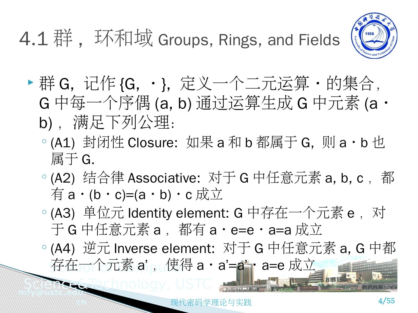 4 .4.1 群 , 环和域 Groups, Rings, and Fields 群 G, 记作 {G, • }, 定义一个二元运算 • 的集合, G 中每一个序偶 (a, b) 通过运算生成 G 中元素 ( a • b ) ,满足下列公理: (A1) 封闭性 Closure: 如果 a 和 b 都属于 G, 则 a • b 也属于 G. (A2) 结合律 Associative: 对于 G 中任意元素 a, b, c ,都有 a • ( b • c )=( a • b ) • c 成立 (A3) 单位元 Identity element: G 中存在一个元素 e ,对于 G 中任意元素 a ,都有 a • e = e • a =a 成立 (A4) 逆元 Inverse element: 对于 G 中任意元素 a, G 中都存在一个元素 a’ ,使得 a • a ’= a’ • a =e 成立