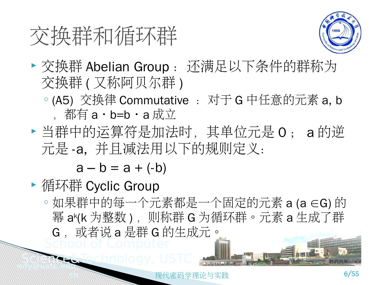 6 .交换群和循环群 交换群 Abelian Group :还满足以下条件的群称为交换群 ( 又称阿贝尔群 ) (A5) 交换律 Commutative :对于 G 中任意的元素 a, b ,都有 a • b=b • a 成立 当群中的运算符是加法时,其单位元是 0 ; a 的逆元是 -a, 并且减法用以下的规则定义: a – b = a + (-b) 循环群 Cyclic Group 如果群中的每一个元素都是一个固定的元素 a (a ∈G) 的幂 a k (k 为整数 ) ,则称群 G 为循环群。元素 a 生成了群 G ,或者说 a 是群 G 的生成元。