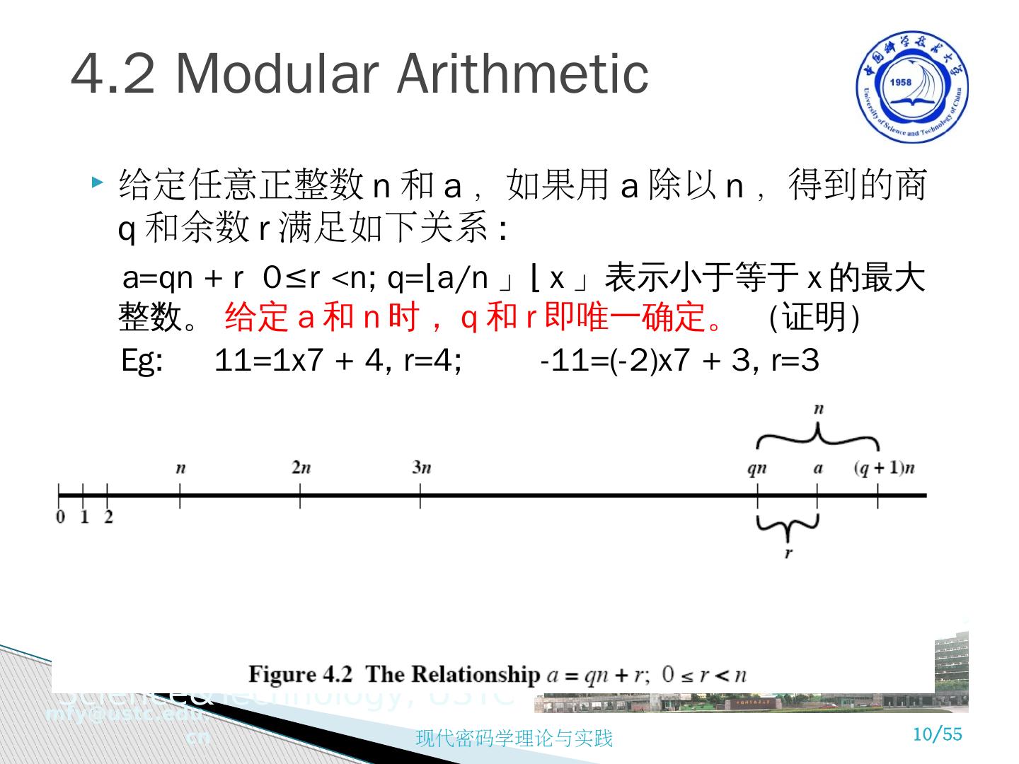 10 .4.2 Modular Arithmetic 给定任意正整数 n 和 a ,如果用 a 除以 n ,得到的商 q 和余数 r 满足如下关系 : a= qn + r 0≤r <n; q = ⌊ a/n 」 ⌊ x 」表示小于等于 x 的最大整数。 给定 a 和 n 时, q 和 r 即唯一确定。 (证明) Eg : 11=1x7 + 4, r=4; -11=(-2)x7 + 3, r=3