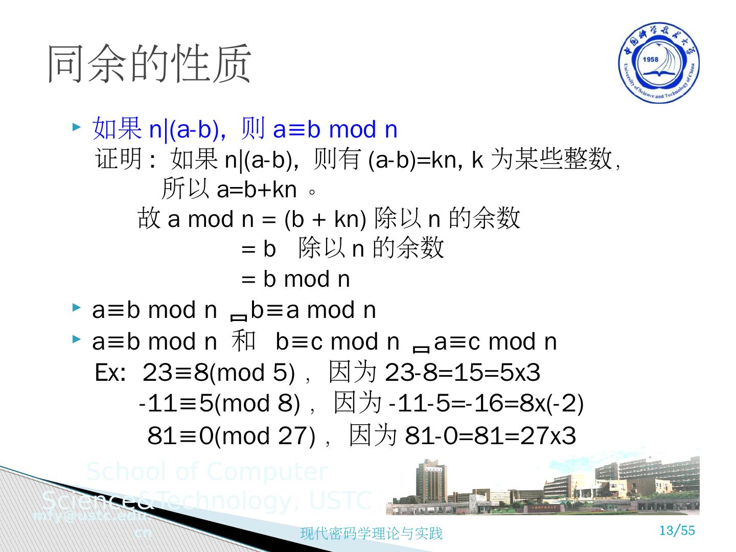 12 .同余 ( congruence) 给定整数 a, b 及 n≠0, 当且仅当 a-b= kn 时, a 与 b 在模 n 时同余,记为 a≡b mod n 或 a≡ n b 例 : 17≡ 5 7 ∵17-7=2*5; 53≡ 7 11 ∵53-11=6*7 a≡ n b 当且仅当 a mod n = b mod n 如果 a 是整数, n 是正整数,定义 a 除以 n 所得之余数为 a 模 n 。对于任意整数 a ,我们总可写出: a = ⌊ a/n 」 × n + (a mod n) 11 mod 7 = 4; -11 mod 7 = 3 如果 (a mod n)=(b mod n), 则称整数 a 和 b 是模 n 同余,表示为 a≡b mod n 或 a≡ n b 73 ≡ 4 mod 23 ; 21 ≡ -9 mod 10