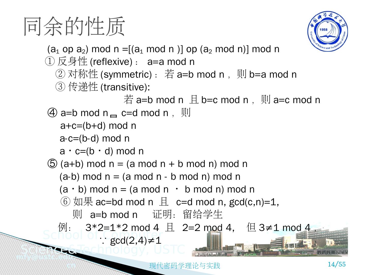 13 .同余的性质 如果 n|(a-b), 则 a≡b mod n 证明 : 如果 n|(a-b), 则有 (a-b)= kn , k 为某些整数, 所以 a= b+kn 。 故 a mod n = (b + kn ) 除以 n 的余数 = b 除以 n 的余数 = b mod n a≡b mod n b≡a mod n a≡b mod n 和 b≡c mod n a≡c mod n Ex: 23≡8(mod 5) ,因为 23-8=15=5x3 -11≡5(mod 8) ,因为 -11-5=-16=8x(-2) 81≡0(mod 27) ,因为 81-0=81=27x3