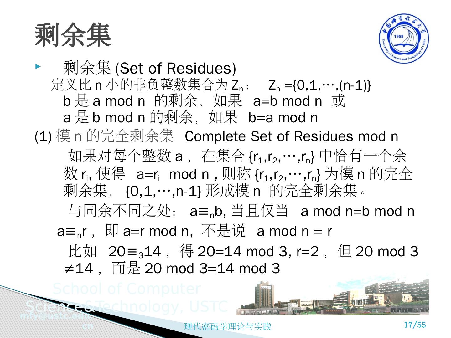 17 .剩余集 (Set of Residues) 定义比 n 小的非负整数集合为 Z n : Z n ={0,1,…,(n-1)} b 是 a mod n 的剩余,如果 a=b mod n 或 a 是 b mod n 的剩余,如果 b=a mod n (1) 模 n 的完全剩余集 Complete Set of Residues mod n 如果对每个整数 a ,在集合 {r 1 ,r 2 ,…, r n } 中恰有一个余数 r i , 使得 a= r i mod n , 则称 {r 1 ,r 2 ,…, r n } 为模 n 的完全剩余集, {0,1,…,n-1} 形成模 n 的完全剩余集。 与同余不同之处: a≡ n b , 当且仅当 a mod n=b mod n a≡ n r ,即 a=r mod n, 不是说 a mod n = r 比如 20≡ 3 14 ,得 20=14 mod 3, r=2 ,但 20 mod 3 ≠14 ,而是 20 mod 3=14 mod 3 剩余集