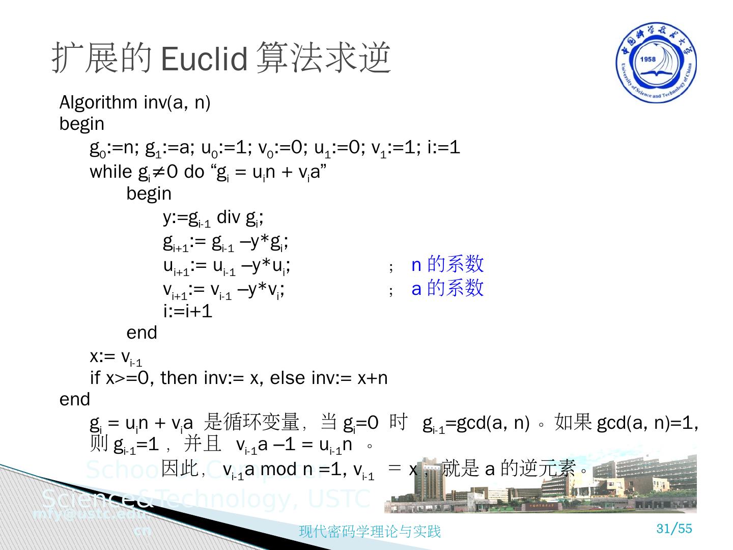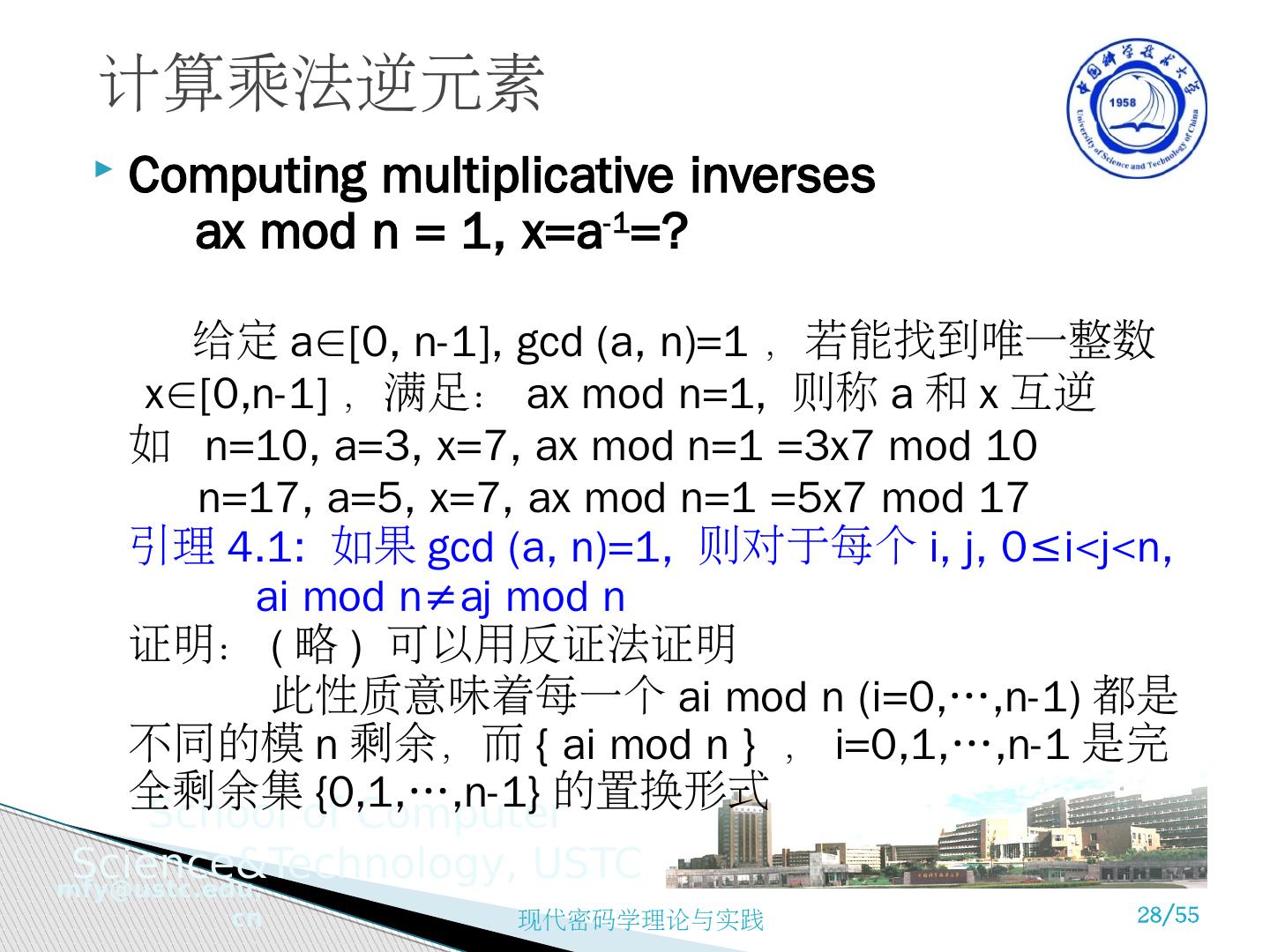 28 .Computing multiplicative inverses ax mod n = 1, x=a -1 =? 给定 a∈[0, n-1], gcd (a, n)=1 ,若能找到唯一整数 x∈[0,n-1] ,满足: ax mod n=1, 则称 a 和 x 互逆 如 n=10, a=3, x=7, ax mod n=1 =3x7 mod 10 n=17, a=5, x=7, ax mod n=1 =5x7 mod 17 引理 4.1: 如果 gcd (a, n)=1, 则对于每个 i , j, 0≤i<j<n, ai mod n≠aj mod n 证明: ( 略 ) 可以用反证法证明 此性质意味着每一个 ai mod n ( i =0,…,n-1) 都是不同的模 n 剩余,而 { ai mod n } , i =0,1,…,n-1 是完全剩余集 {0,1,…,n-1} 的置换形式 计算乘法逆元素