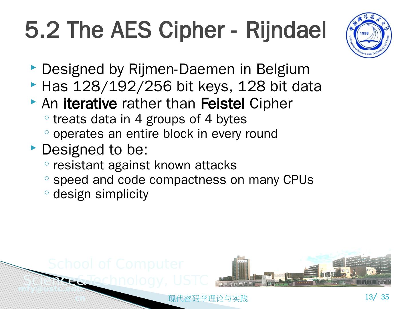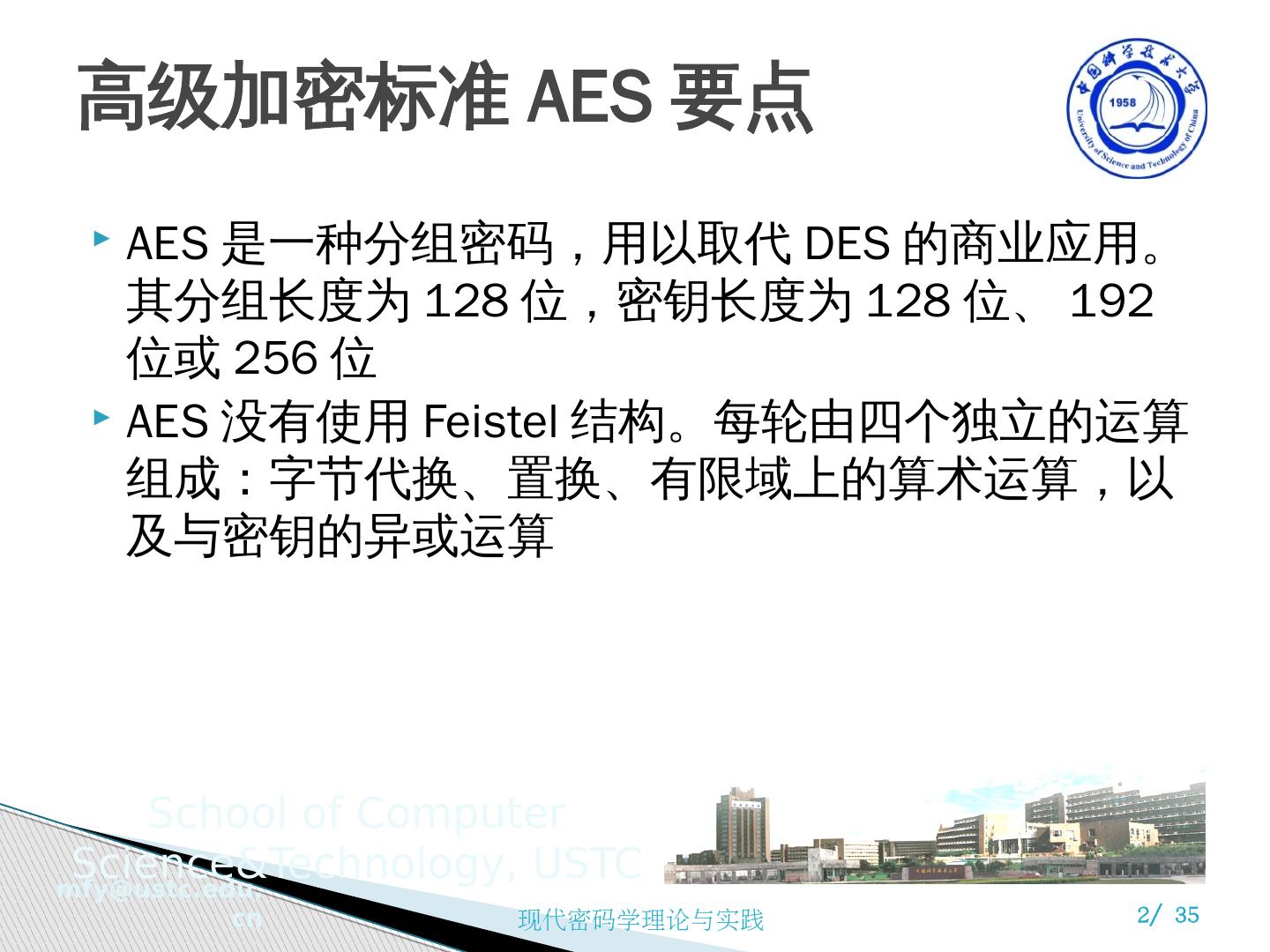 1 .现代密码学理论与实践 第 5 章 AES 密码 Fifth Edition by William Stallings 苗付友 mfy@ustc.edu.cn 2016 年 10 月