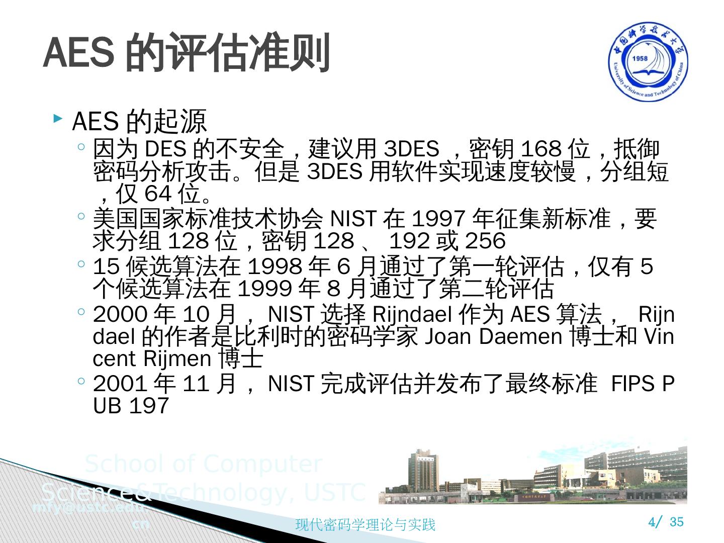 4 .AES 的评估准则 AES 的起源 因为 DES 的不安全,建议用 3DES ,密钥 168 位,抵御密码分析攻击。但是 3DES 用软件实现速度较慢,分组短,仅 64 位。 美国国家标准技术协会 NIST 在 1997 年征集新标准,要求分组 128 位,密钥 128 、 192 或 256 15 候选算法在 1998 年 6 月通过了第一轮评估,仅有 5 个候选算法在 1999 年 8 月通过了第二轮评估 2000 年 10 月, NIST 选择 Rijndael 作为 AES 算法, Rijndael 的作者是比利时的密码学家 Joan Daemen 博士和 Vincent Rijmen 博士 2001 年 11 月, NIST 完成评估并发布了最终标准 FIPS PUB 197