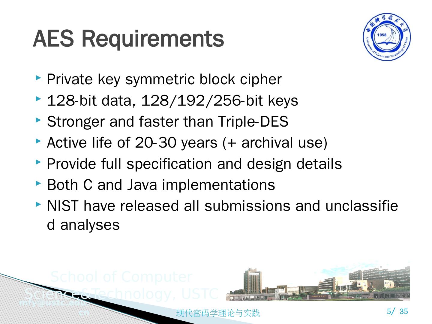 5 .AES Requirements Private key symmetric block cipher 128-bit data, 128/192/256-bit keys Stronger and faster than Triple-DES Active life of 20-30 years (+ archival use) Provide full specification and design details Both C and Java implementations NIST have released all submissions and unclassified analyses