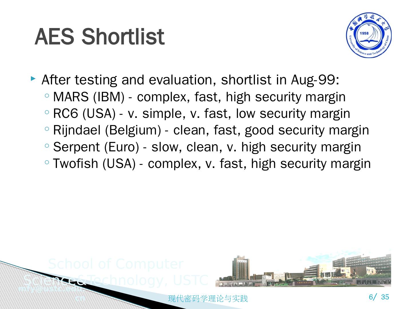 6 .AES Shortlist After testing and evaluation, shortlist in Aug-99: MARS (IBM) - complex, fast, high security margin RC6 (USA) - v. simple, v. fast, low security margin Rijndael (Belgium) - clean, fast, good security margin Serpent (Euro) - slow, clean, v. high security margin Twofish (USA) - complex, v. fast, high security margin