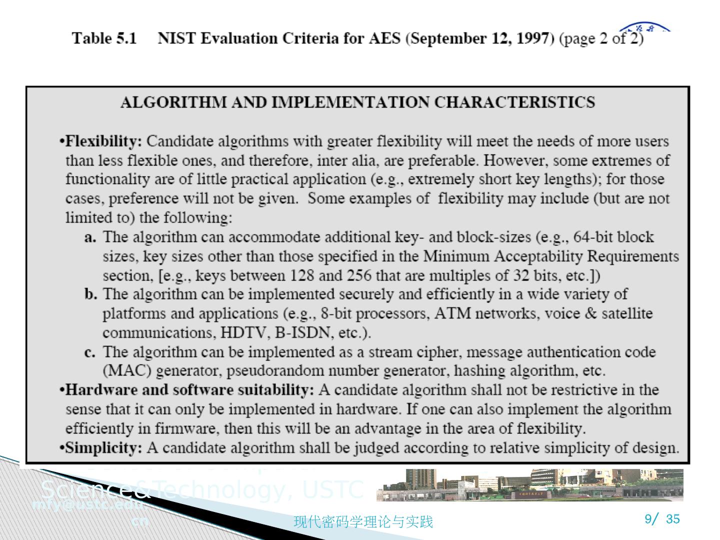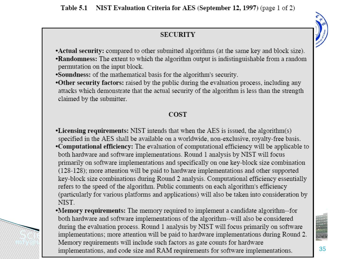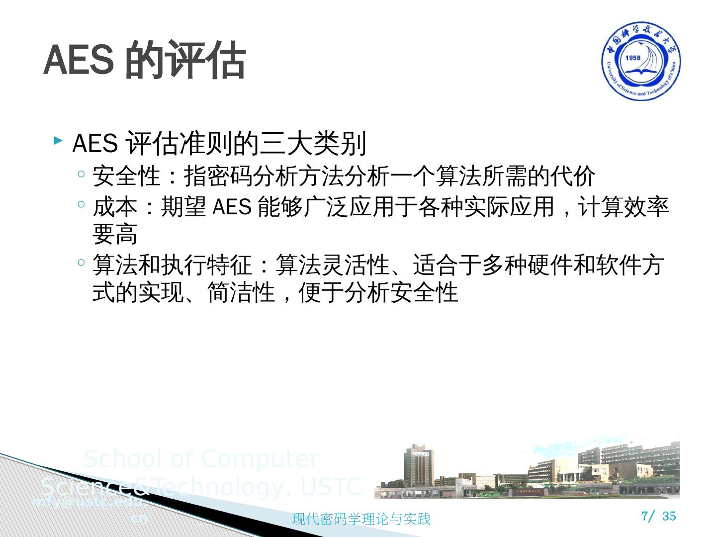 7 .AES 的评估 AES 评估准则的三大类别 安全性:指密码分析方法分析一个算法所需的代价 成本:期望 AES 能够广泛应用于各种实际应用,计算效率要高 算法和执行特征:算法灵活性、适合于多种硬件和软件方式的实现、简洁性,便于分析安全性