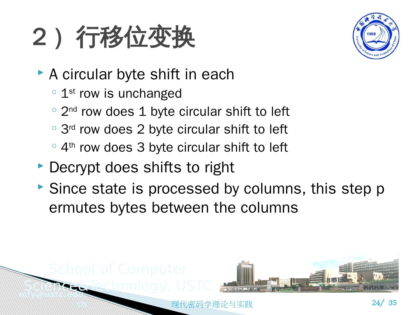 24 .2 ) 行移位变换 A circular byte shift in each 1 st row is unchanged 2 nd row does 1 byte circular shift to left 3 rd row does 2 byte circular shift to left 4 th row does 3 byte circular shift to left Decrypt does shifts to right Since state is processed by columns, this step permutes bytes between the columns