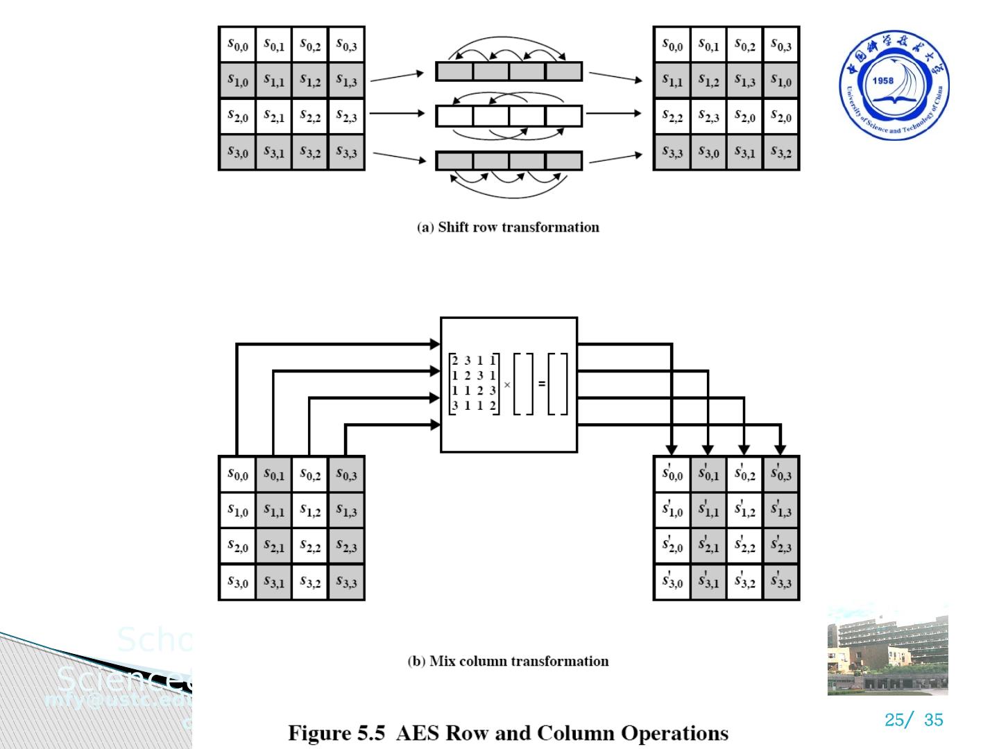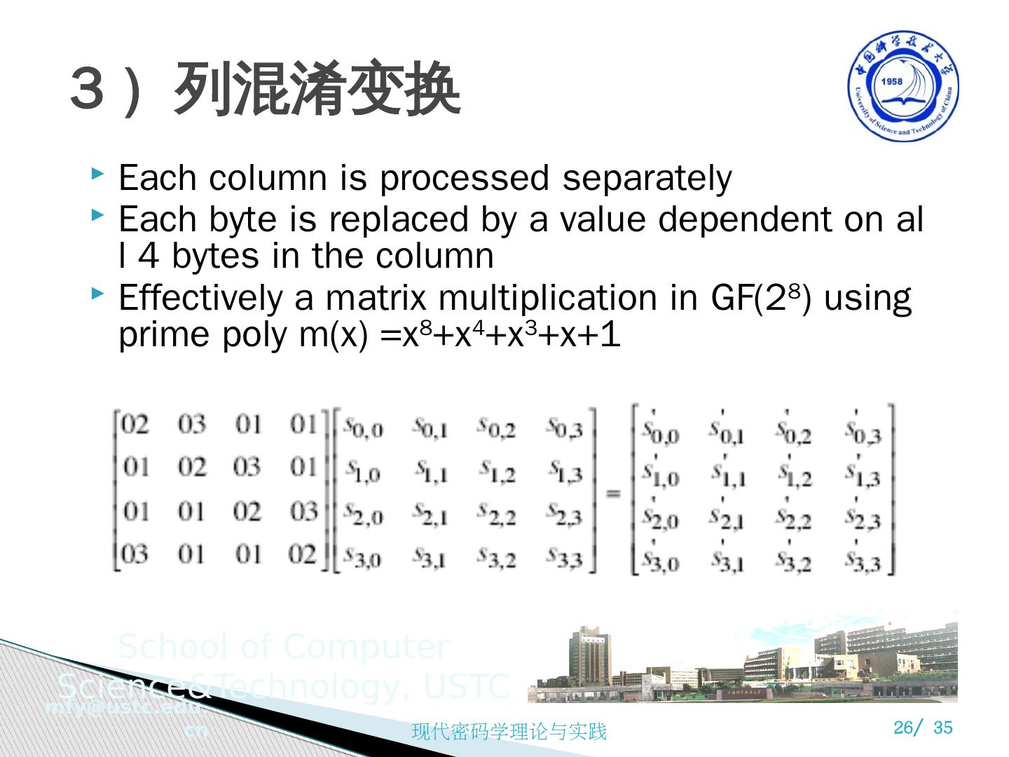 26 .3 ) 列混淆变换 Each column is processed separately Each byte is replaced by a value dependent on all 4 bytes in the column Effectively a matrix multiplication in GF(2 8 ) using prime poly m(x) =x 8 +x 4 +x 3 +x+1