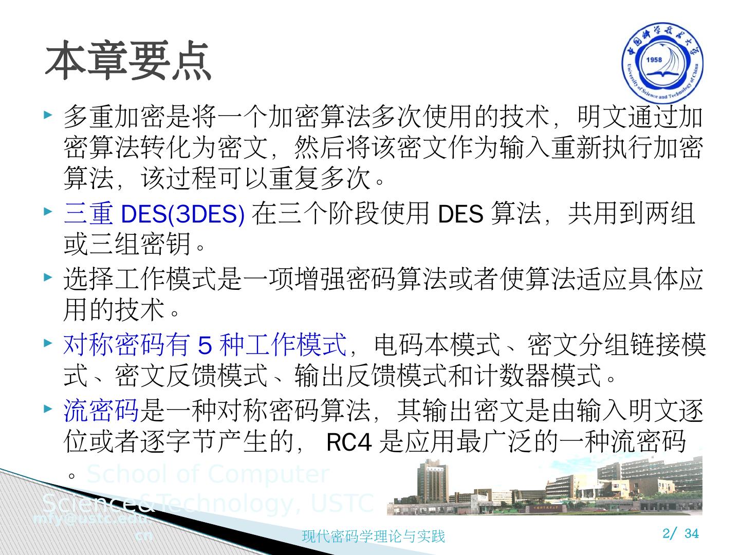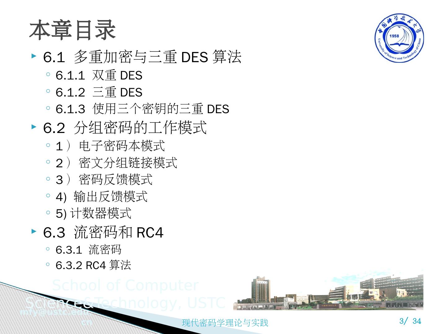 3 .本章目录 6.1 多重加密与三重 DES 算法 6.1.1 双重 DES 6.1.2 三重 DES 6.1.3 使用三个密钥的三重 DES 6.2 分组密码的工作模式 1 )电子密码本模式 2 )密文分组链接模式 3 )密码反馈模式 4) 输出反馈模式 5) 计数器模式 6.3 流密码和 RC4 6.3.1 流密码 6.3.2 RC4 算法
