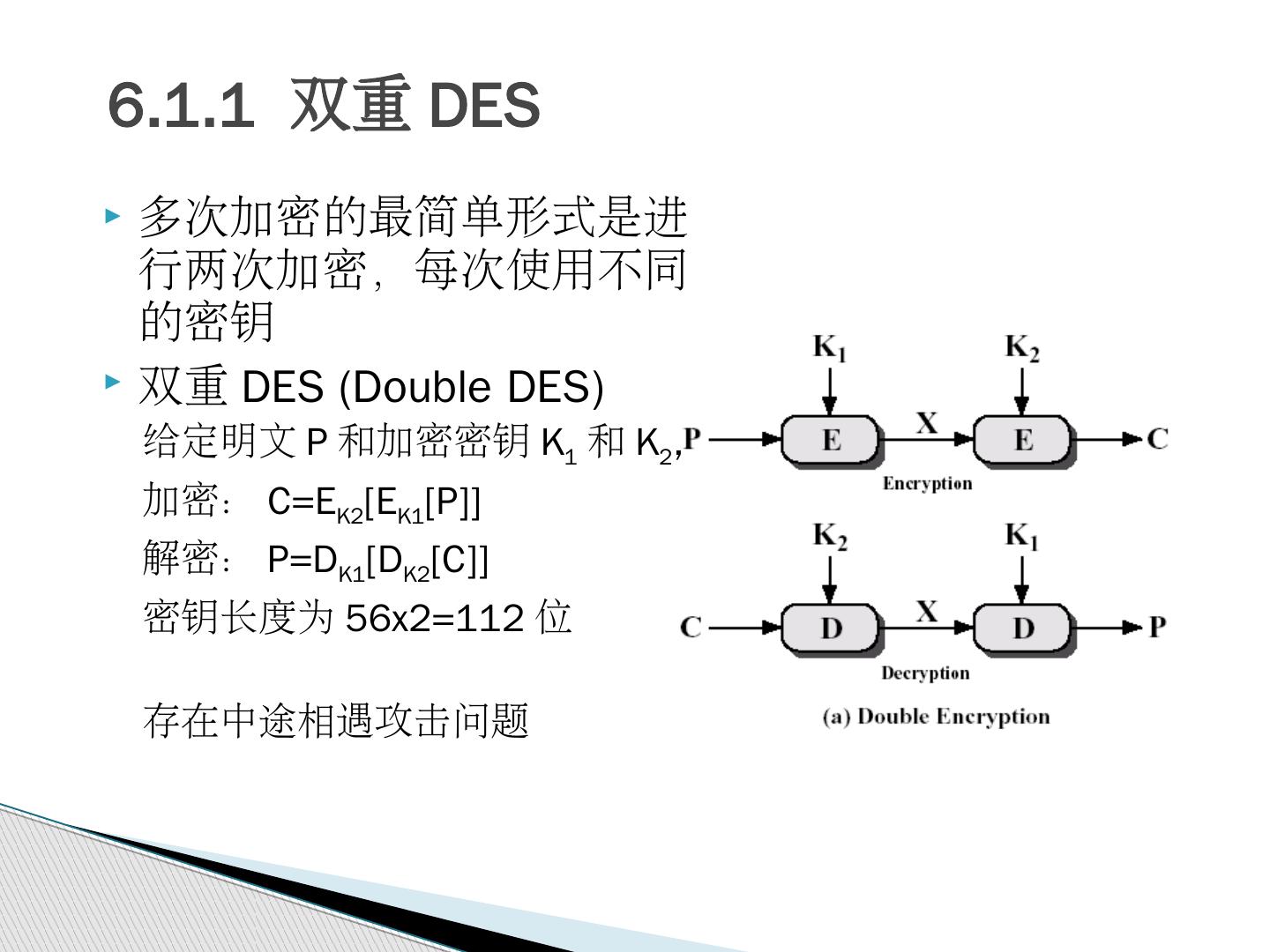 5 .6.1.1 双重 DES 多次加密的最简单形式是进行两次加密,每次使用不同的密钥 双重 DES (Double DES) 给定明文 P 和加密密钥 K 1 和 K 2 , 加密: C=E K2 [E K1 [P]] 解密: P=D K1 [D K2 [C]] 密钥长度为 56x2=112 位 存在中途相遇攻击问题