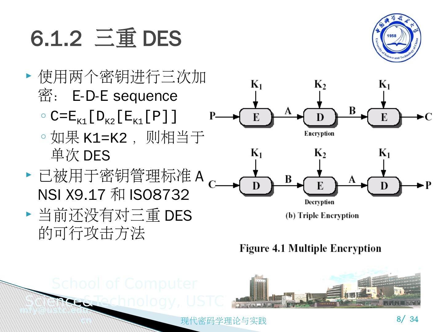 8 .6.1.2 三重 DES 使用两个密钥进行三次加密: E-D-E sequence C=E K1 [D K2 [E K1 [P]] 如果 K1=K2 ,则相当于单次 DES 已被用于密钥管理标准 ANSI X9.17 和 ISO8732 当前还没有对三重 DES 的可行攻击方法