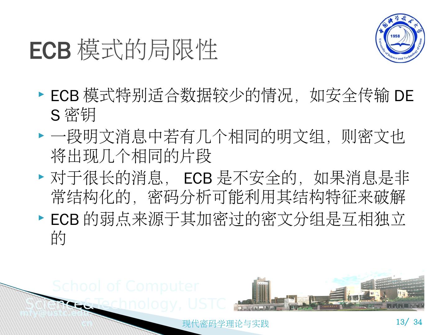13 .ECB 模式特别适合数据较少的情况,如安全传输 DES 密钥 一段明文消息中若有几个相同的明文组,则密文也将出现几个相同的片段 对于很长的消息, ECB 是不安全的,如果消息是非常结构化的,密码分析可能利用其结构特征来破解 ECB 的弱点来源于其加密过的密文分组是互相独立的 ECB 模式的局限性