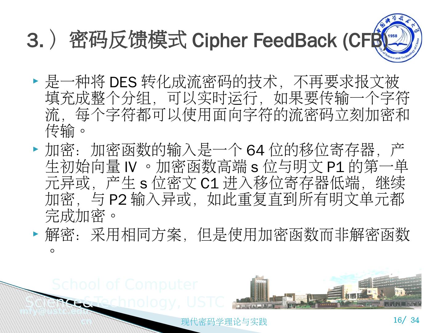 15 .CBC 的优点和局限 每个密文分组依赖于所有明文分组 明文消息中的任何一点变化都会影响所有的密文分组 发送方和接收方需要共享初始向量 Initial Value (IV) 如果 IV 被明文传送,则攻击者可以改变第一个分组的某些位,然后预先改变 IV 中的某些位,则接收者收到的 P1 也就相应改变了 因此, IV 必须是一个固定的值 (as in EFTPOS) 或者必须用 ECB 方式在消息之前加密传送 在消息的最后,还要处理不够长度的分组 可以填充已知非数据值,或者在最后一块补上填充位长度 eg . [ b1 b2 b3 0 0 0 0 5] <- 3 data bytes, then 5 bytes pad+count
