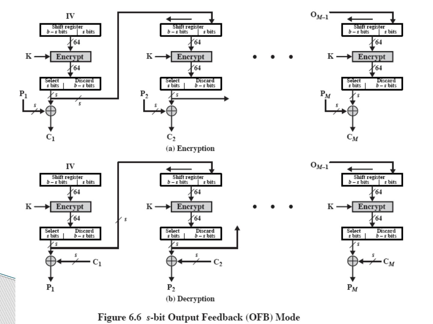 19 .输出反馈模式 Output FeedBack (OFB) 结构上类似 CFB ,但是 OFB 中加密函数输出被反馈回移位寄存器, CFB 中是密文单元被反馈回移位寄存器。优点是传输中的比特差错不会传播。 4) 输出反馈模式 Output FeedBack (OFB)