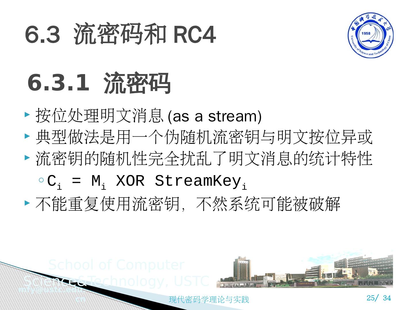 25 .6.3 流密码和 RC4 按位处理明文消息 (as a stream) 典型做法是用一个伪随机流密钥与明文按位异或 流密钥的随机性完全 扰乱 了明文消息的统计特性 C i = M i XOR StreamKey i 不能重复使用流密钥,不然系统可能被破解 6.3.1 流密码