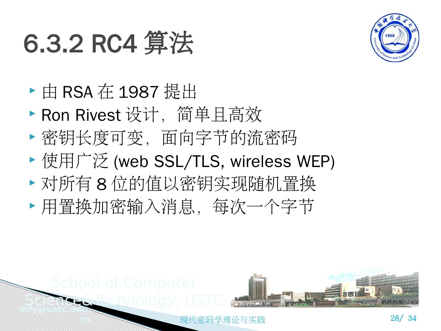 28 .6.3.2 RC4 算法 由 RSA 在 1987 提出 Ron Rivest 设计,简单且高效 密钥长度可变,面向字节的流密码 使用广泛 (web SSL/TLS, wireless WEP) 对所有 8 位的值以密钥实现随机置换 用置换加密输入消息,每次一个字节